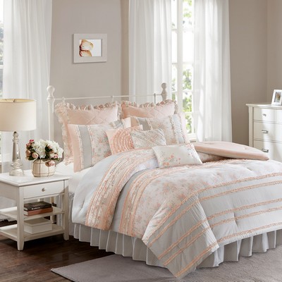 | Madison Park Twin/Twin XL 1 Comforter: 68"W x 90"L 1 Standard Sham: 20"W x 26"L 1 Bedskirt: 39"W x 75"L + 15"D 1 Euro Sham: 26"W x 26"L 1 Decorative Pillow: 12"W x 18"L 1 Decorative Pillow: 16"W x 16"L 1 Decorative Pillow: 18"W x 18"L Comforter/Sham: 180TC cotton percale, printed, piecing, tufted , 180TC cotton/polyester reverse, 270g/m2 polyester filling Bedskirt: 180TC cotton/polyester drop, polyester fabric platform Euro Sham: 180TC cotton/poly Pillow: 180TC cotton/poly cover, polyester filling Cottage/Country Style Includes 7 Piece(s) MACHINE WASH COLD, GENTLE CYCLE, AND SEPARATELY. DO NOT BLEACH. TUMBLE DRY LOW, REMOVE PROMPTLY, DO NOT IRON. IF THERE IS NO FREE MOVEMENT IN THE WASHER OR DRYER, USE LARGE CAPACITY COMMERCIAL WASHER/DRYER. Madison Park Serendipity brings a touch of charm and grace to your cozy retreat. This lovely set features a 180 thread count cotton fabric with a delicate floral print in peach and grey, contrasted by grey and white polka dots, and reverses to a solid light peach. Each pattern is separated by a ruffle detail that adds a feminine flair. The edges are also adorned with a ruffle detail for extra elegance. The set is complemented by three decorative pillows and two Euro shams (1 Euro sham for Twin sizes) that showcase embroidery and fabric manipulation skills to add texture and depth to the bed. |