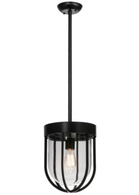 | Although the bulb appears caged, the illumination and unique aesthetic appeal are not. Hand finished in Solar Black the inverted frame and hardware house an Edison A19 incandescent within a Clear glass dome. Meyda Tiffany Pendant |
