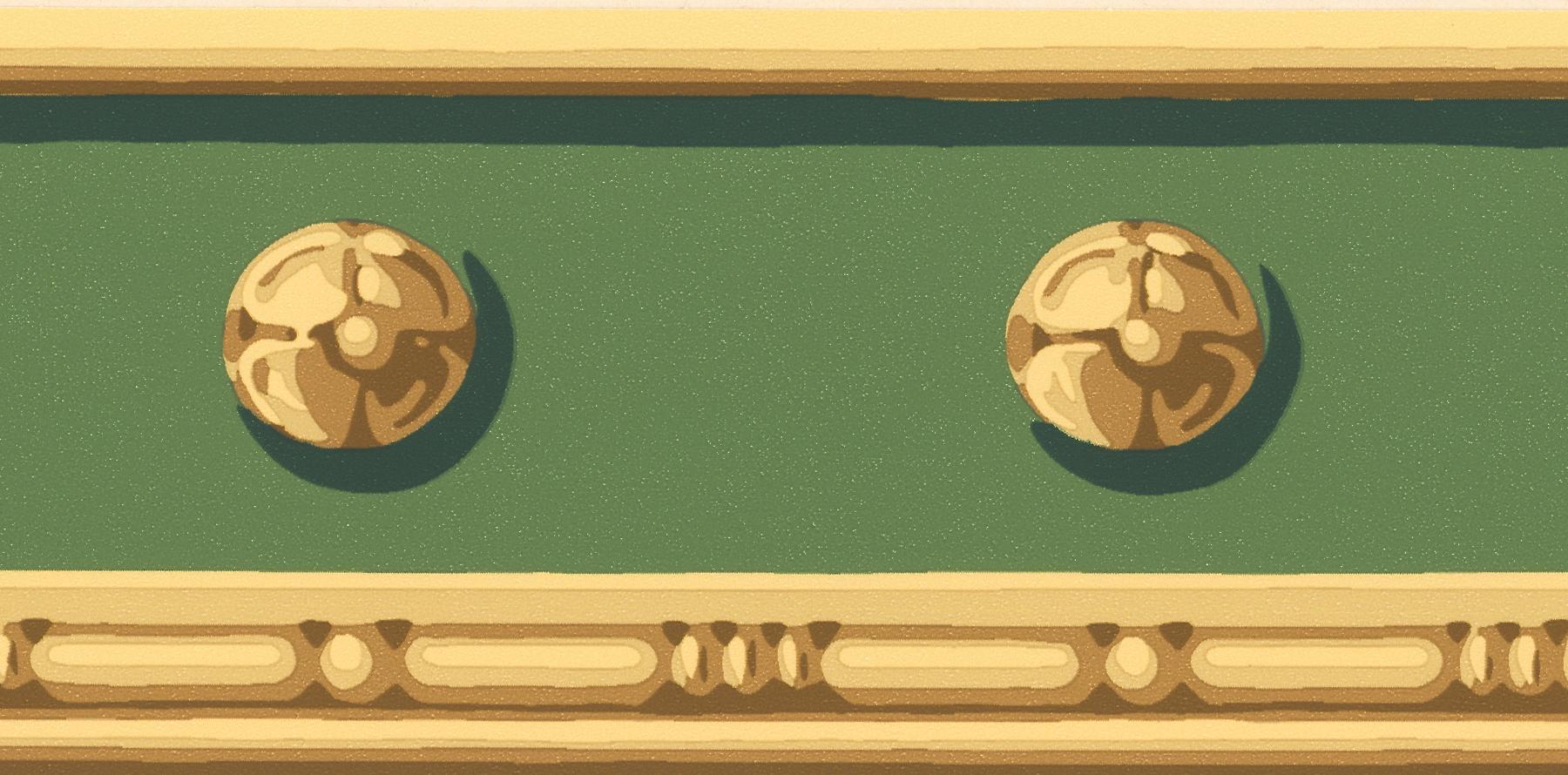 The classy green and gold colors of this border bring the fun illusion that your wall has a wooden rail complete with knobs.
