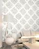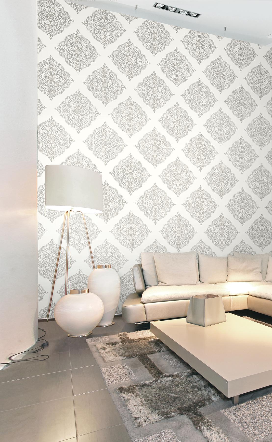 | A magnificent cream backdrop with a delicate glitter effect paves a decadent path for this gleaming flock of silver medallions. A rare and lovely site on walls filled with both enchantment and wonder. Page: 23 Match: Straight Single Double Roll Width (in): 20.5 Single Double Roll Length (ft): 16.5 Unpasted Strippable |