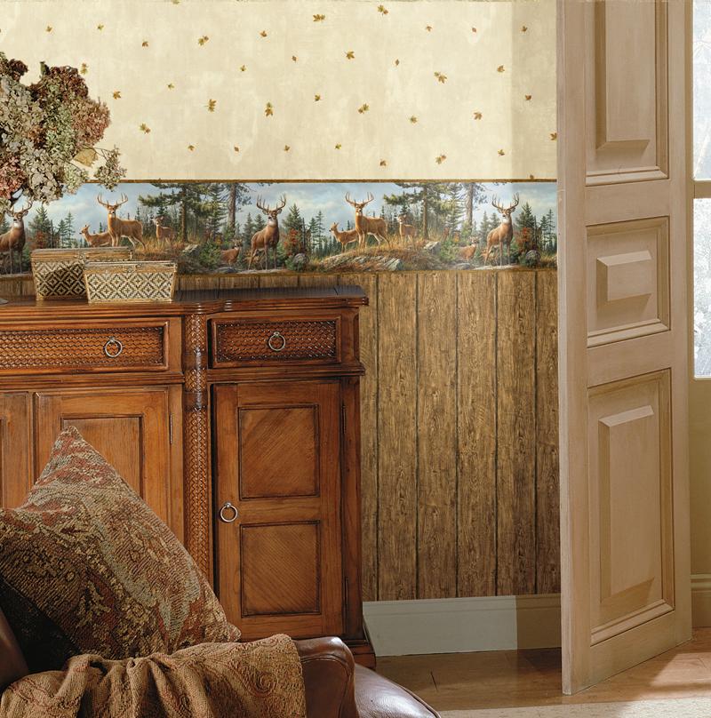 | Regal whitetail deer observe the wooded land surrounding them in this artwork by the Hautman Brothers. This border will add a lovely portrait to any room. Page: 75 Roll Width (in): 8 Roll Length (ft): 15 Prepasted Strippable |