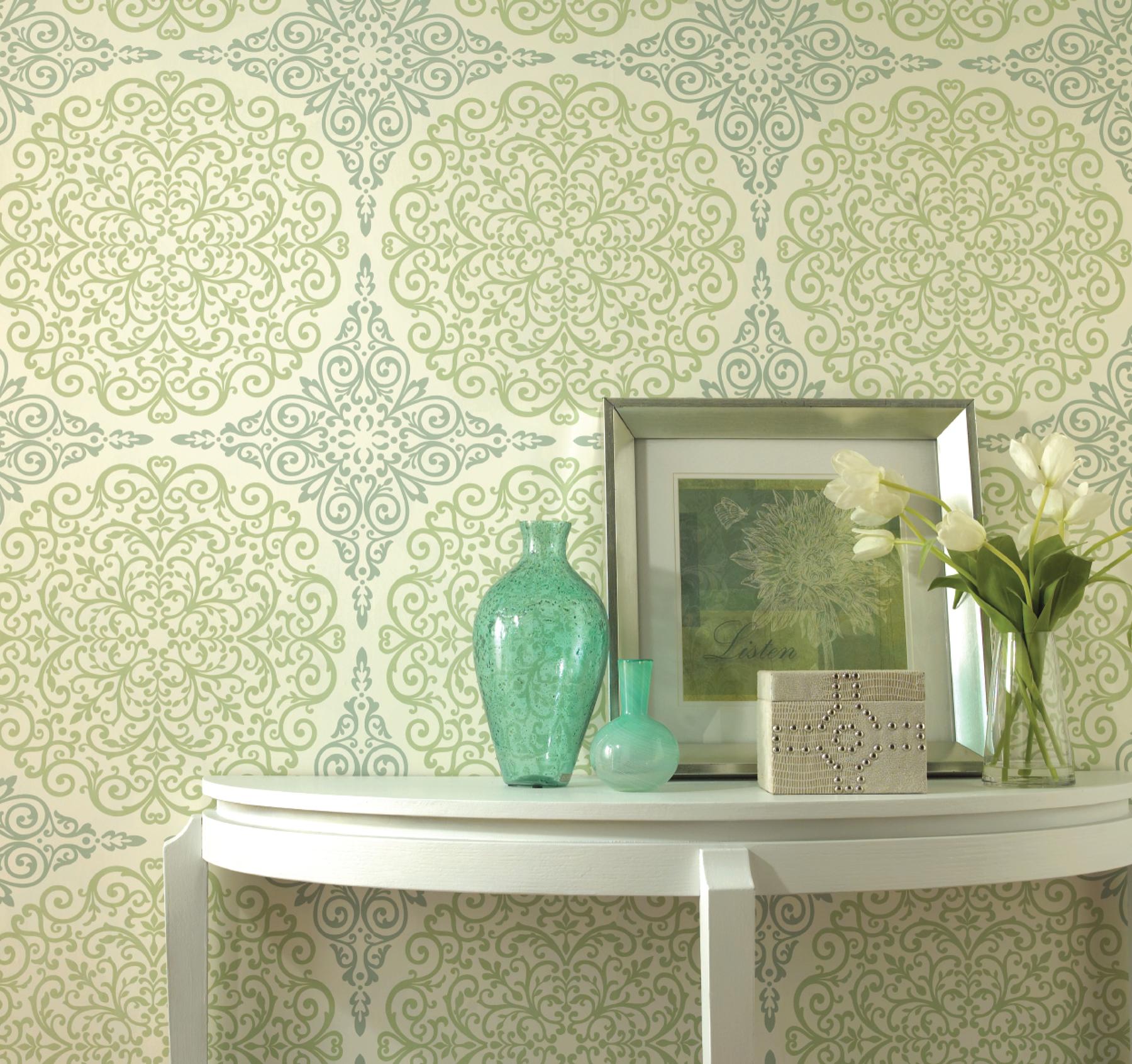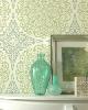 A picture of global elegance surrounds this opulent style wallcovering of a gorgeous damask print flourishing a hip medallion design. A mint blue and cream color scheme make it a perfectly serene decor piece.