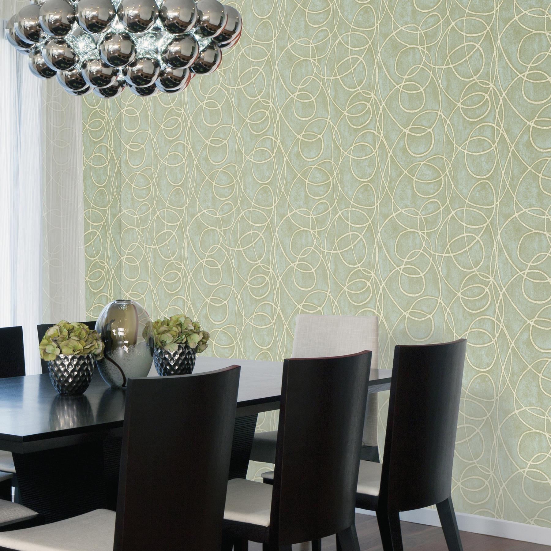 With a trendy geometric swirl made rustic upon a heavily distressed backdrop this modern wallcovering design looks stunning in a Glistening color scheme of green bronze and sky blue.