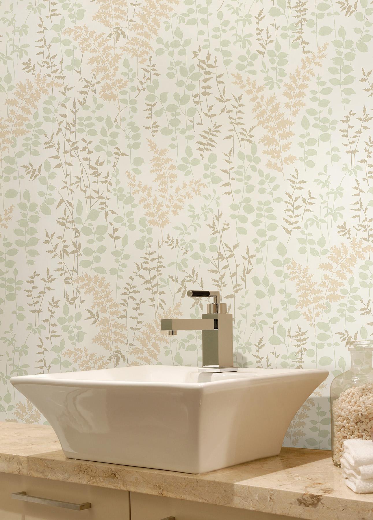 | A stunning forest motif wallcovering in new mints creams and khakis adds both texture and artistry to bathroom walls. Page: 145 Match: Drop Single Double Roll Width (in): 20.5 Single Double Roll Length (ft): 16.5 Prepasted Peelable |