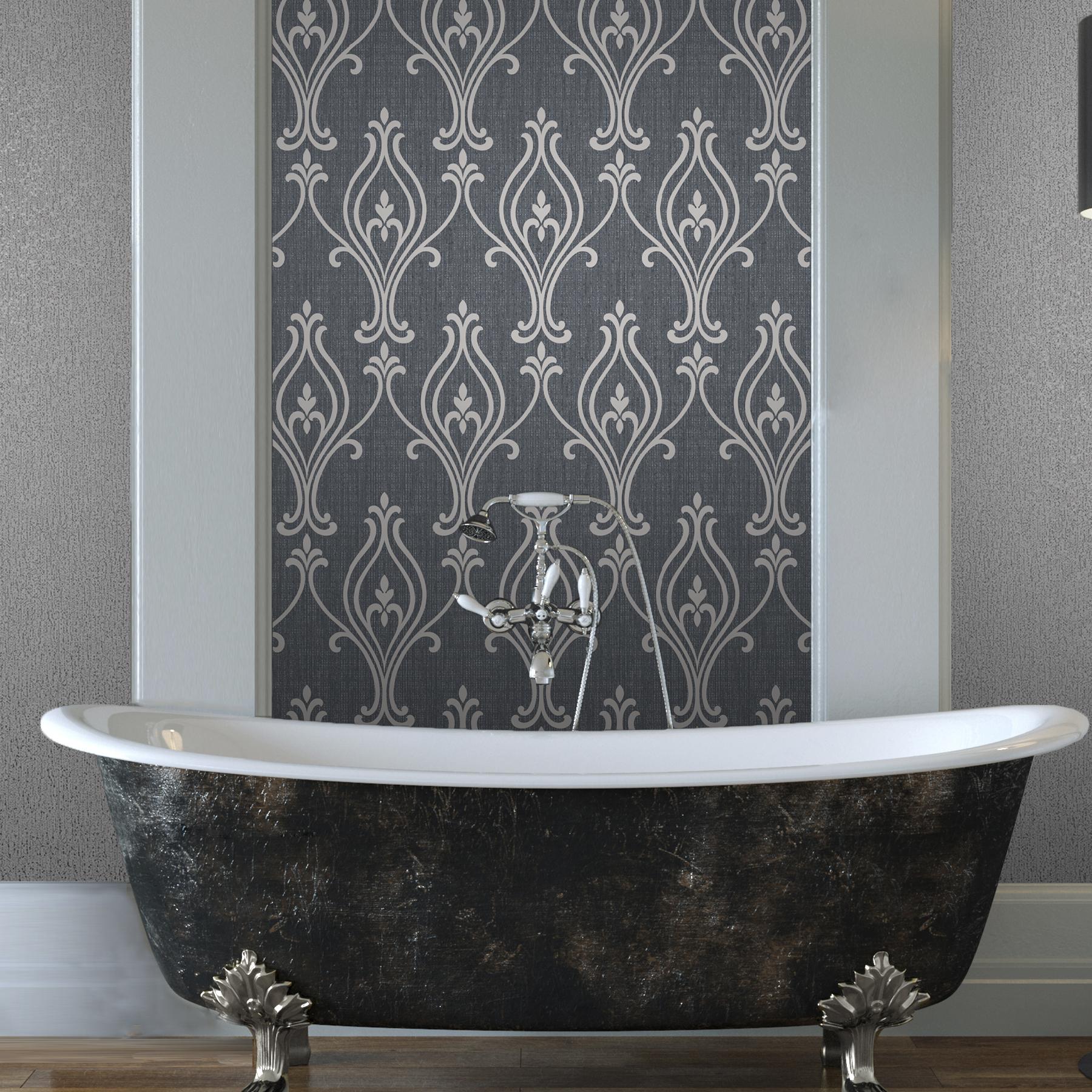 | An intriguing and lovely nouveau damask wallcovering with a modern twist. Burnished silk metallics and a glitter dusted texture add glamour to this curvaceous design. Gravure screen printing and embossed printing techniques give the charcoal grey de Page: 60 Match: Straight Single Double Roll Width (in): 20.5 Single Double Roll Length (ft): 16.5 Unpasted Strippable |