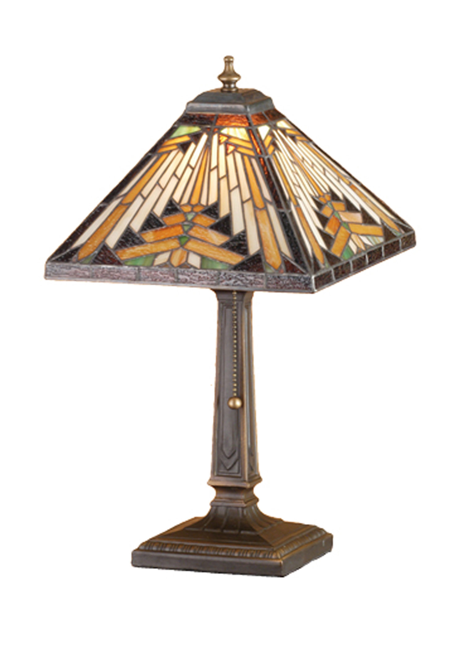 | Warm earth toned Bone Beige and Moccasin Tan stained glass, accented with glistening Root Brown and Sage Green, is used to make this intricate interlocking patterned shade. A Mission style lamp base in a hand applied Mahogany Bronze finish supports the handsome square shade inspired by Native American artwork. Handcrafted with the copper foil technique developed by Louis Comfort Tiffany, this accent lamp is a true masterpiece.