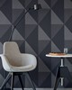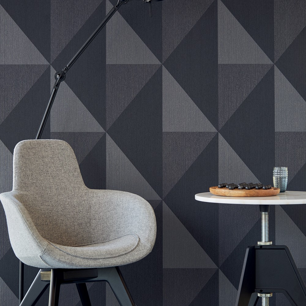 This mid-century current-inspired design features three right isosceles triangles in black, dark grey, and metallic silver converge to form a diamond. Raised inks akin to woodgrain spread across the design, giving it a textural feel. Diamond is an unpasted, non woven wallpaper.