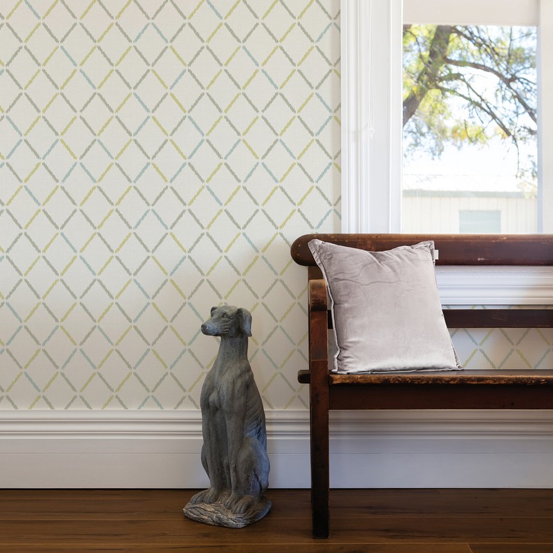 Breathe a new life into walls with this charming linen inspired print. A yellow, grey and light blue geometric pops against an off-white background, while raised inks complement its ikat flair. Allotrope is an unpasted, non woven wallpaper.