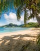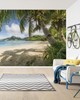 Photorealistic mural featuring a tropical beach framed by clear waters and a palm tree