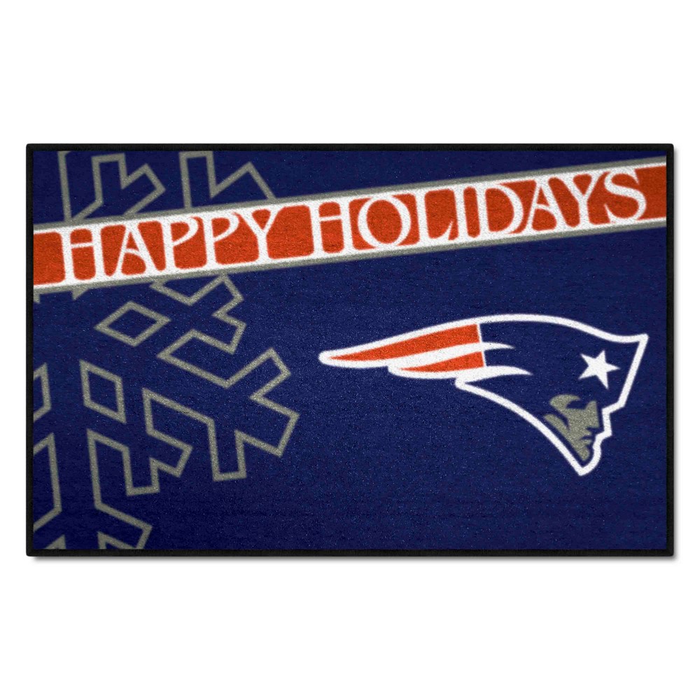 | New England Patriots Starter Mat Accent Rug - 19in. x 30in. Happy Holidays Starter Mat 9 Ounce, 100 % Nylon Face Recycled vinyl backing for a durable and longer-lasting product Machine made and tufted in the USA Non-skid backing with serged borders for added durability Machine washable; vacuum regularly and spot clean for any easy and quick clean Officially licensed and chromojet-printed in true team colors for vibrant, lasting color NFL - New England Patriots in Massachusetts NFL National Football League |