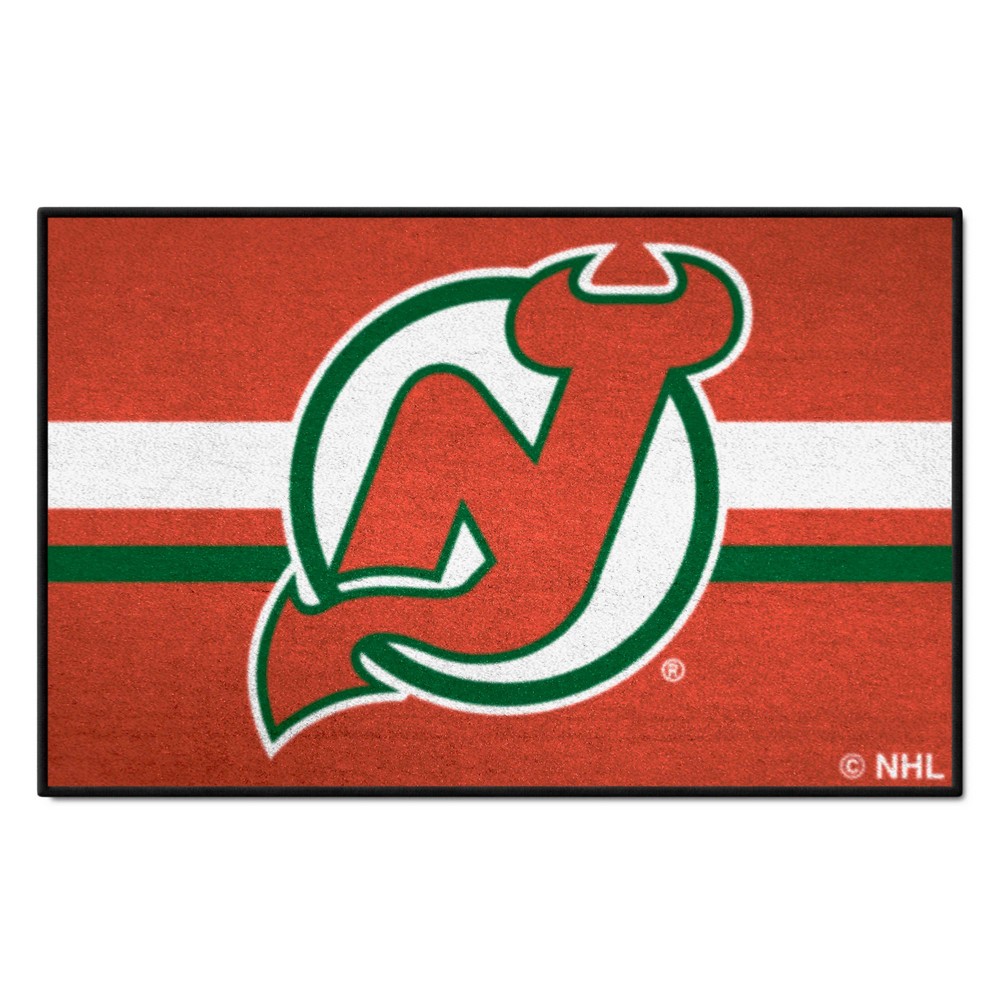 | New Jersey Devils Starter Mat Accent Rug - 19in. x 30in. Uniform Alternate Design 9 Ounce, 100 % Nylon Face Recycled vinyl backing for a durable and longer-lasting product Machine made and tufted in the USA Non-skid backing with serged borders for added durability Machine washable; vacuum regularly and spot clean for any easy and quick clean Officially licensed and chromojet-printed in true team colors for vibrant, lasting color NHL - New Jersey Devils in New Jersey NHL National Hockey League |
