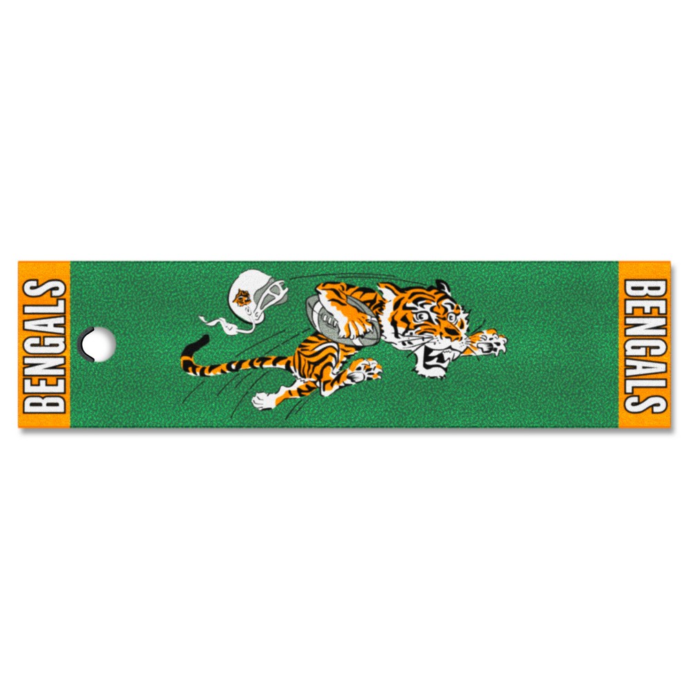 | Cincinnati Bengals Putting Green Mat - 1.5ft. x 6ft., NFL Vintage Realistic putting surface (11* on golf Stimpmeter) Includes putting target barrier/backstop Durable vinyl backing keeps mat in place 100% Nylon Face Doubles as a runner when not in use Officially licensed and chromojet printed in true team colors NFLV - Cincinnati Bengals in Ohio NFL National Football League |