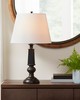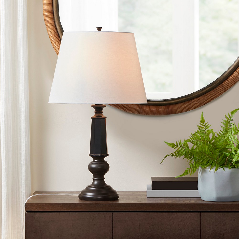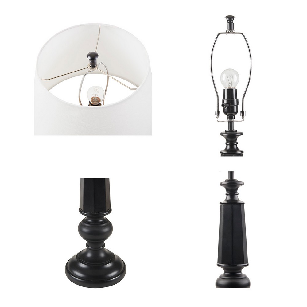 | Martha Stewart See below Overall: 14"Dia x 24.25"H Body: 5.75"Dia x 13.25"H Shade: 10"Dia x 14"Dia x 10"H Socket: 1.5"Dia x 2.5"H Cord Length: 60" 80% resin, 20% Fabric Base Material: 100% resin Base Finish: Glossy black Shade Material: 100% ployester Traditional Style Includes 1 Piece(s) • Spot clean only; Handle with care • To protect finish, do not apply abrasives or household cleaners, dust with soft dry cloth • Do not exceed specified wattage Landsdown 24.25"H faceted black table lamp is a part of Martha Stewart's lily pond collection and is sure to light up any room in your home. The classic, traditional base design features a sculptural and faceted pedestal style in a high-gloss black finish and is paired with a tapered drum shaped light-colored shade. The lamp also includes an on/off rotary switch on socket and comes with 1 Type A, 9W LED light bulb. It has a polarized plug and is not dimmable. Spot clean only. 2 year limited warranty. |