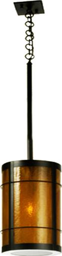 This pendant fixture is a caged cylinder of textured Honey art glass bound by a frame finished in a baked Hammer textured Black paint. The transitional fixture with neutral color times, is handmade in the U.S.A. by Meyda artisans.