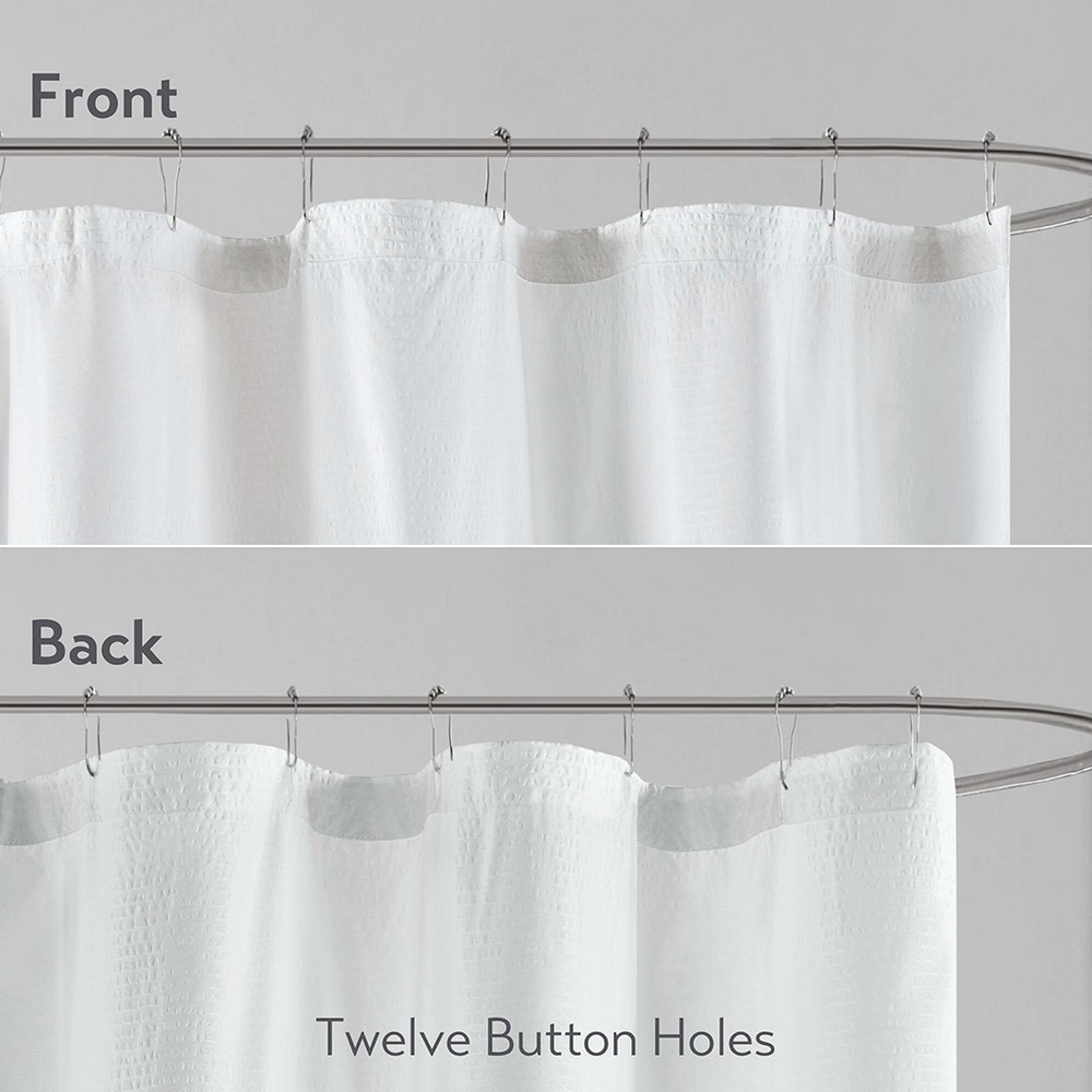 | Madison Park 72x72" 1 Shower Curtain: 72"W x 72"L 100% Polyester microfiber Modern/Contemporary Style Includes 1 Piece(s) Machine Washable Add a refreshing touch to your bathroom decor with our Madison Park Ara Ombre Printed Seersucker Shower Curtain. This shower curtain features a blue ombre print on an embossed seersucker fabric, for a contemporary look that’s rich in texture. The lightest color of the ombre design starts at the top and gradients to a darker color towards the bottom for a naturally soothing look. Machine washable for easy care, this contemporary shower curtain measures 72"x72" and is easy to hang with the 12 button holes at the top. A water repellant liner is not included, and highly recommended for the utmost protection. |
