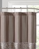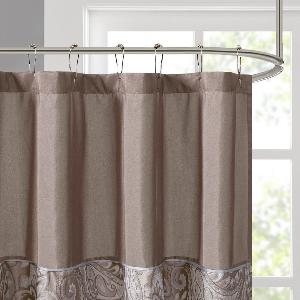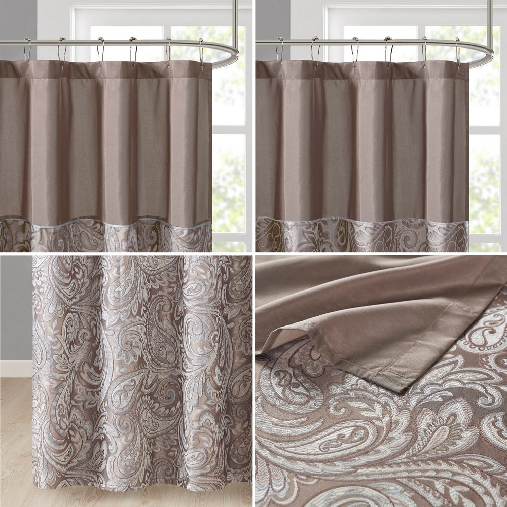 | Madison Park 72x72" 1 Shower Curtain: 72"W x 72"L 100% polyester, jacquard Traditional Style Includes 1 Piece(s) Machine wash cold, gentle cycle, and separately. Do not bleach. Tumble dry low, remove promptly. Do not iron. If there is no free movement in the washer or dryer, use large capacity commercial washer/dryer. The Madison Park Aubrey Polyester Jacquard Shower Curtain creates a sophisticated modern look in your bathroom. The pieced design flaunts a beautiful woven jacquard in an updated paisley motif with a large solid stripe at the top of the shower curtain. This jacquard shower curtain is machine washable for easy care. Complete the collection and look with coordinate bath towels, bath rugs, bedding, window, and dec pillow - available and sold separately. |