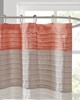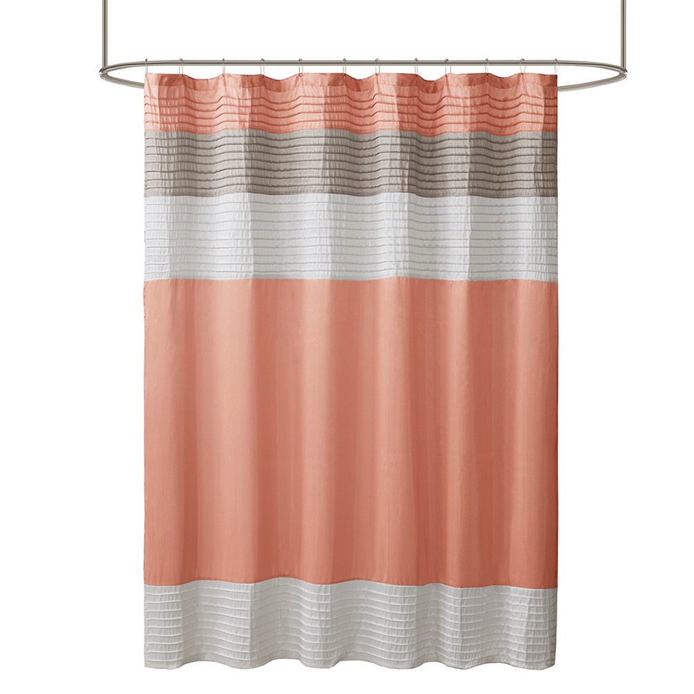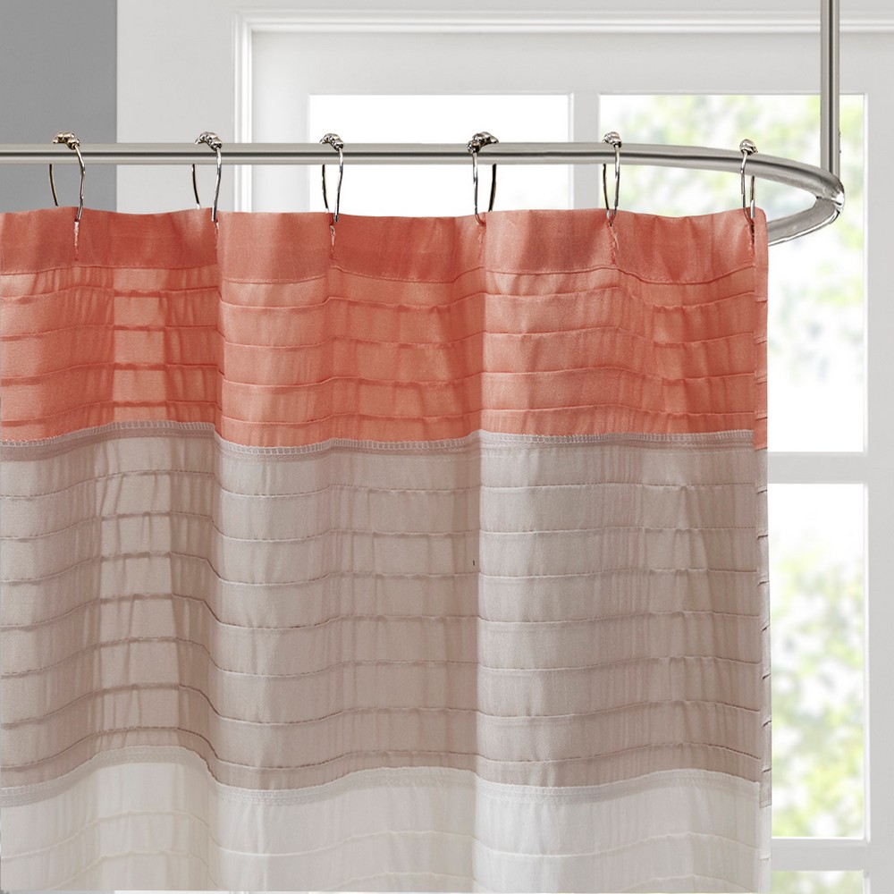 | Madison Park 72x72" 1 Shower Curtain: 72x72" 100% polyester faux silk Transitional Modern Style Includes 1 Piece(s) MACHINE WASH COLD, GENTLE CYCLE, AND SEPARATELY. DO NOT BLEACH. TUMBLE DRY LOW, REMOVE PROMPTLY. DO NOT IRON. IF THERE IS NO FREE MOVEMENT IN THE WASHER OR DRYER, USE LARGE CAPACITY COMMERCIAL WASHER/DRYER. Easily transition your bathroom with this simple, yet beautifully classic shower curtain. The faux silk dupioni fabric has a natural light sheen and drapes beautifully, while also machine washable for easy care. This lightweight shower curtain features pieced and pintucking details creating a rich texture and a unique color block design, sure to freshen up any space. Pattern layout may vary due to variation of sizes. A water repellant liner is not included, and highly recommended. Complete the collection and look with coordinate bath decor, bedding, and window decor - available and sold separately. |