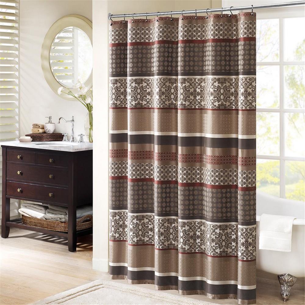 | Madison Park 72x72" 1 Shower Curtain: 72x72" 100% Polyester Jacquard Traditional Style Includes 1 Piece(s) MACHINE WASH COLD, GENTLE CYCLE, AND SEPARATELY. DO NOT BLEACH. TUMBLE DRY LOW, REMOVE PROMPTLY. DO NOT IRON. IF THERE IS NO FREE MOVEMENT IN THE WASHER OR DRYER, USE LARGE CAPACITY COMMERCIAL WASHER/DRYER. Update your space with the Princeton shower curtain. This polyester jacquard creates character with intricate geometric and damask prints in amix of brown, red, and ivory tones. |