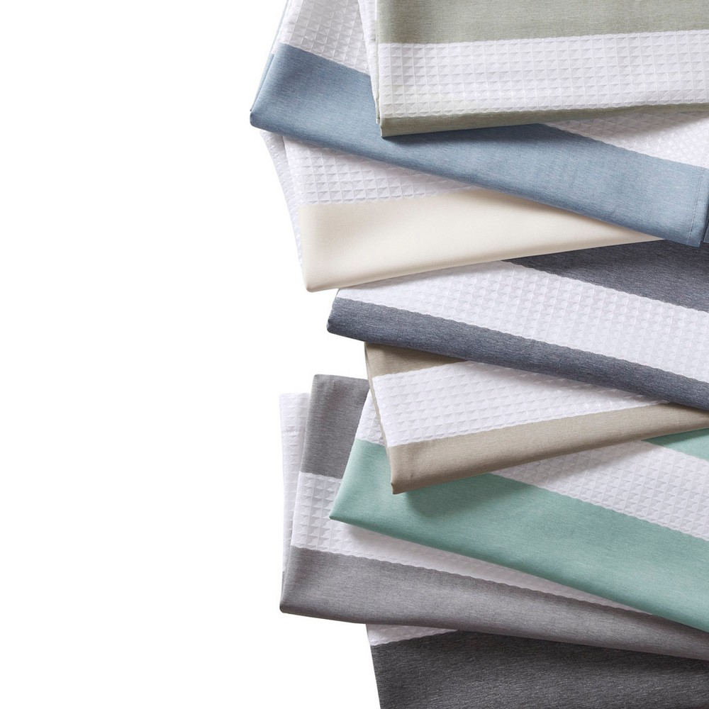 | Madison Park 72x78" 1 Shower Curtain: 72"W x 84"L 100% Polyester, 3M water repellent scotchgard treatment Casual Style Includes 1 Piece(s) Machine wash cold, gentle cycle, and separately. Do not bleach. tumble dry low, remove promptly. Do not iron. Update your space with the Madison Park Spa Waffle Shower Curtain with 3M Treatment. Featuring a fresh and updated stripe design, this shower curtain is made of a light heathered colored fabric pieced with a white waffle weave base creating a beautiful texture for the perfect spa touch to your decor. A temporary 3M Scotchgard water repellent treatment keeps your curtain looking newer, longer and is active for multiple washes. A waterproof liner is not included but still highly recommended to keep this shower curtain in its best condition; Hooks and Rod also not included and should be purchased separately. Various colors and sizes are available to fit any bathroom space. Size shown in image is standard 72x72", stripe design may vary per all other sizes. Complete the collection with coordinate Spa Waffle Bath Towel and Spa Cotton Bath Rug, available and sold separately. |
