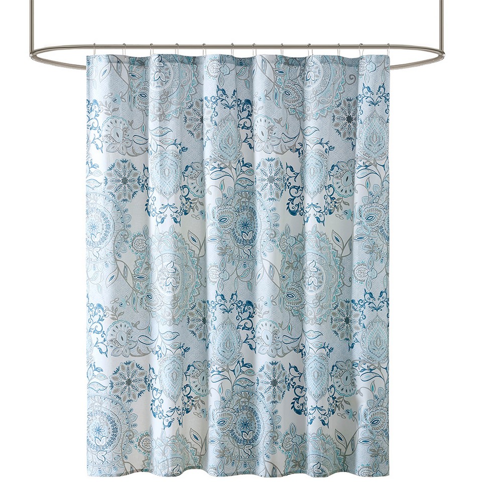 | Madison Park 72x72" 1 Shower Curtain: 72"W x 72"L 144TC cotton percale, printed Vintage/Shabby Chic Style Includes 1 Piece(s) Machine Washable Refresh your bathroom with our Madison Park Isla shower curtain. This printed shower curtain flaunts a beautiful floral and medallion motif in soft blue and neutral watercolor hues. While the 100% cotton percale base adds natural appeal for an organic touch to any decor. Machine washable for easy care, this shower curtain is also OEKO-TEX certified meaning it does not contain any harmful substances or chemicals, for the best in quality comfort and wellness. Each shower curtain measure 72"x72" and is finished with 12 button holes at the top making it easy to hang; hooks, rod, and a water repellant liner are not included and will need to be purchased separately. Complete the look with coordinating bedding, available and sold separately. |