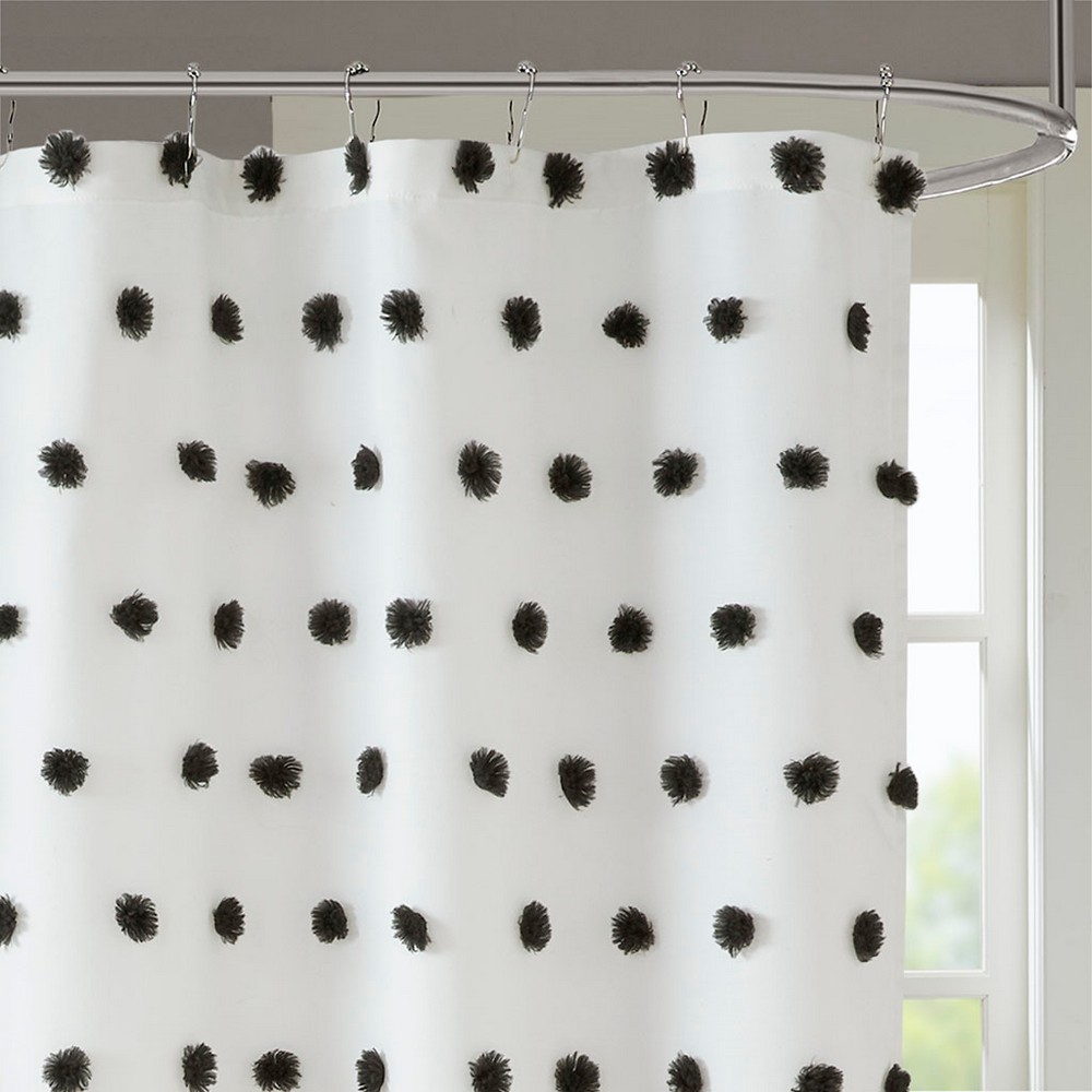 Add a fun update to your space with the Madison Park Sophie shower curtain. The solid white background features rows of soft black fabric pom poms, adding beautiful texture and a stylish update to any bathroom. Machine Washable for easy care; Each shower curtain measure 72"x72" and is finished with 12 button holes at the top making it easy to hang; hooks, rod, and a water repellant liner are not included and will need to be purchased separately.