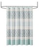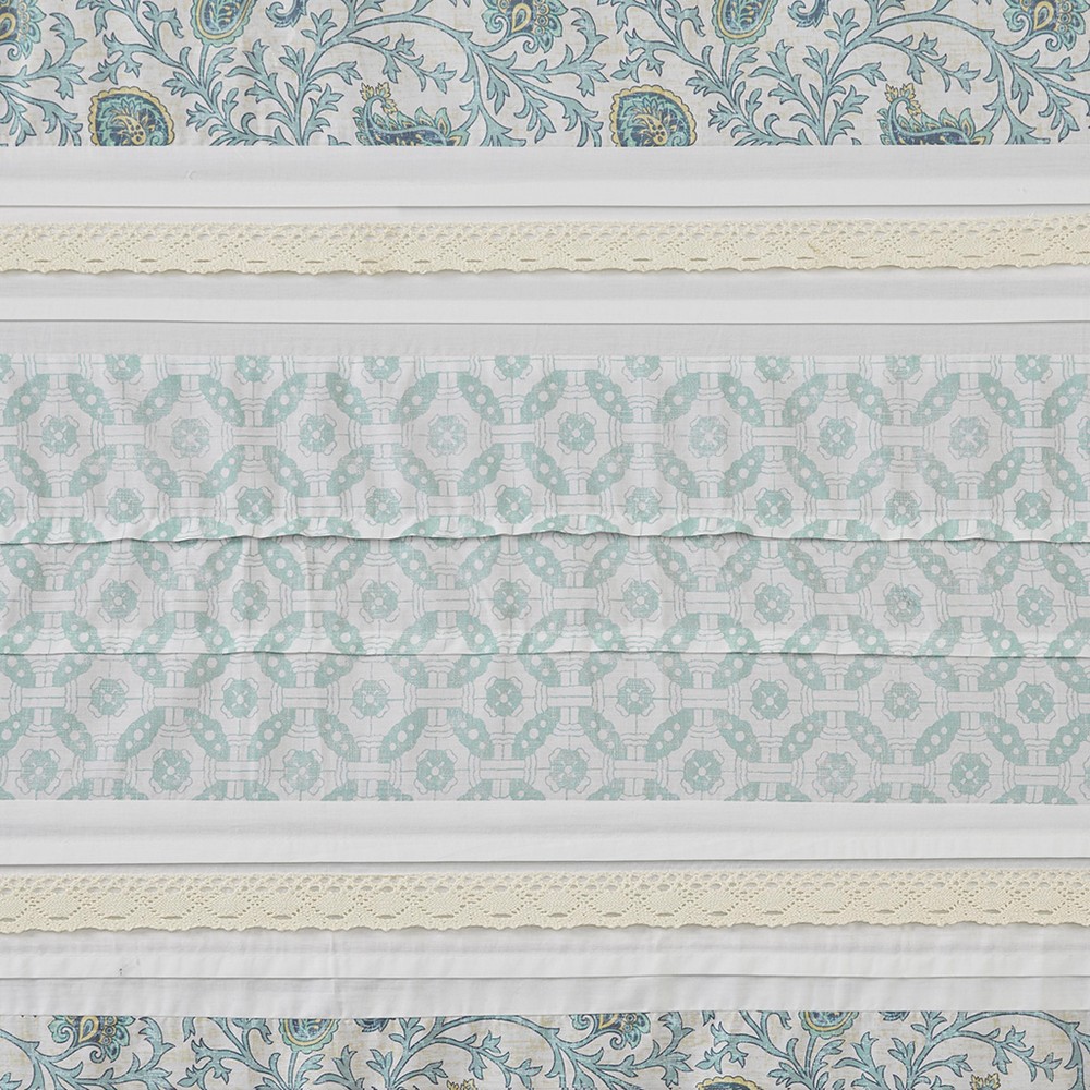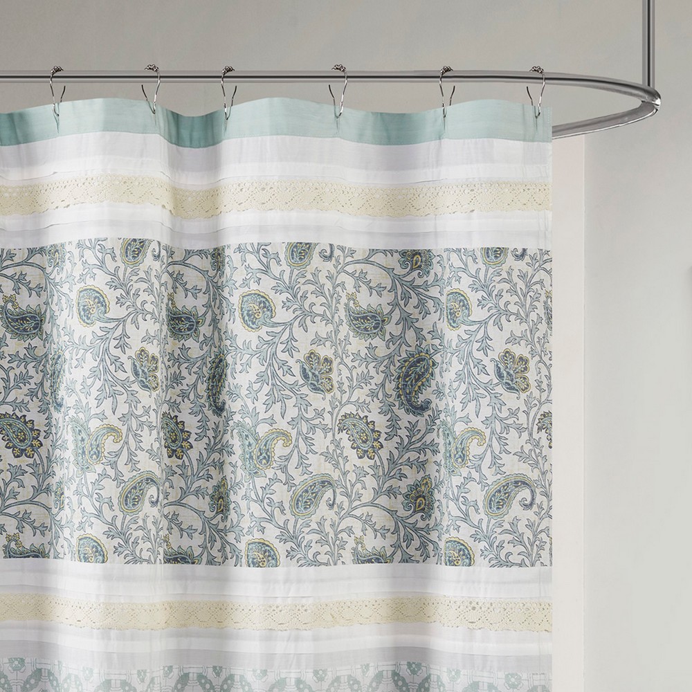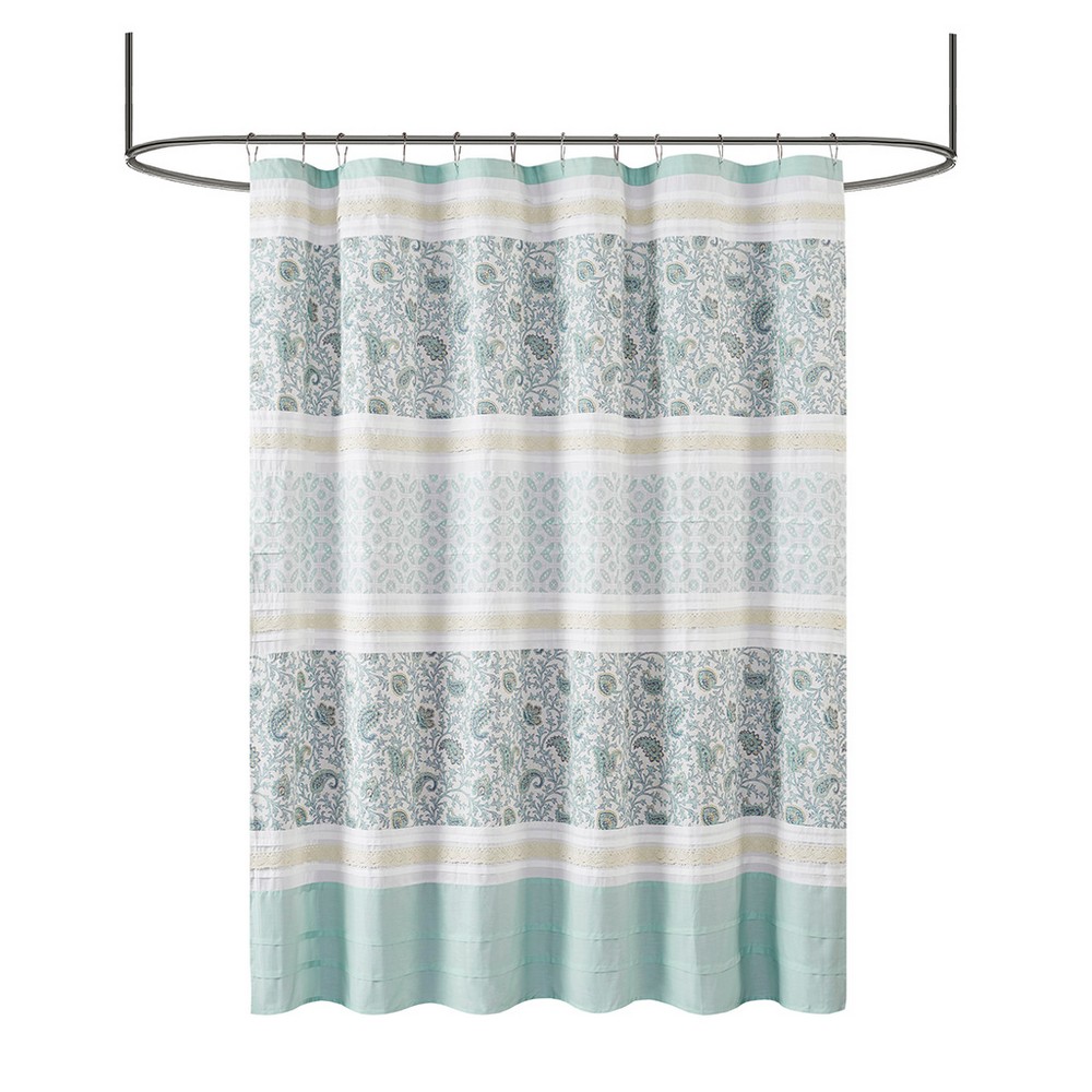 | Madison Park 72x72" 1 Shower Curtain: 72x72" 180TC cotton percale, printed, pieced Farmhouse/Country/Cottage Style Includes 1 Piece(s) Machine wash cold, gentle cycle, and separately. Do not bleach. Tumble dry low, remove promptly. Do not iron. If there is no free movement in the washer or dryer, use large capacity commercial washer/dryer. For a charming and stylish touch to your bathroom, our Madison Park Dawn cotton shower curtain holds all of the perfect elements to do shabby chic the right way. A mixture of soft aqua, periwinkle, and hints of green are printed in a paisley design alongside pin tucked white fabric that is separated by beautiful lace taping. Finished with 12 button holes at the top makes this shower curtain easy to assemble hooks and simply hang on any standard rod (hooks and rod not included). This shower curtain is also OEKO-TEX certified, meaning it does not contain any harmful substances or chemicals, ensuring quality comfort and wellness. Each shower curtain measures 72x72" and is machine washable for easy care; to keep this shower curtain in the best condition a water repellant liner is highly recommended (liner not included and should be purchase separately). |