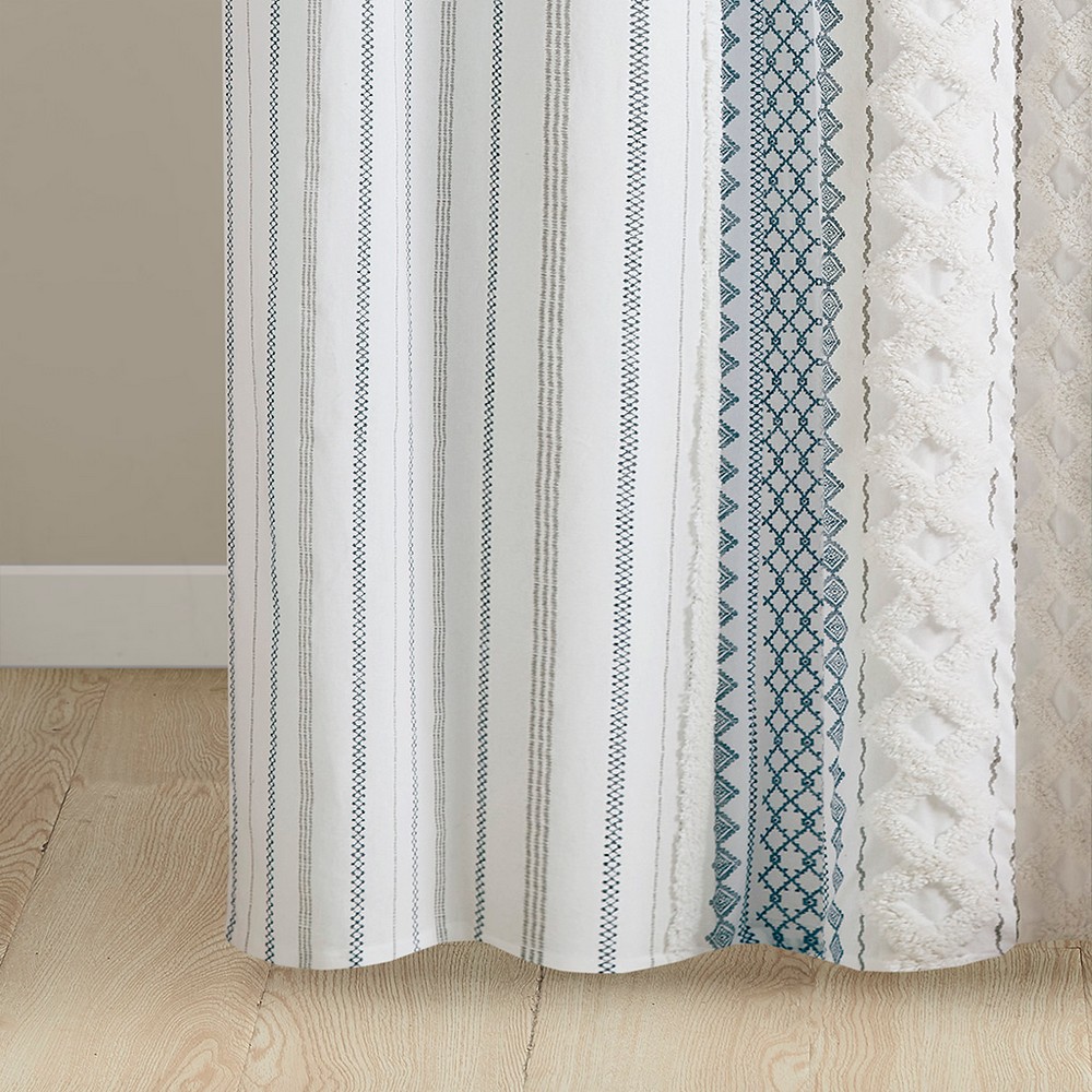 Imani White/Navy Cotton Printed Shower Curtain with Chenille