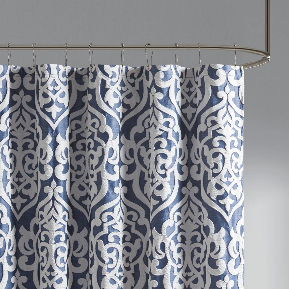 | Madison Park 72x72" 1 Shower Curtain: 72"W x 72"L 100% Polyester Jacquard Traditional Style Includes 1 Piece(s) Machine Washable Add a touch of class to your bathroom with our Madison Park Odette Jacquard Shower Curtain. This luxurious textured shower curtain flaunts a gorgeous silver damask medallion design on a stria navy jacquard ground that adds rich texture and dimension to the lavish look. Measuring 72x72", each shower curtain is finished with 12 button holes on top making it easy to assemble hooks and hang onto rod (hooks and rod not included). To better preserve this beautiful shower curtain, a water repellant liner is highly recommended and can be purchased separately (liner not included). Machine washable for easy care; complete the collection with coordinate matching bedding, alas available and sold separately. |