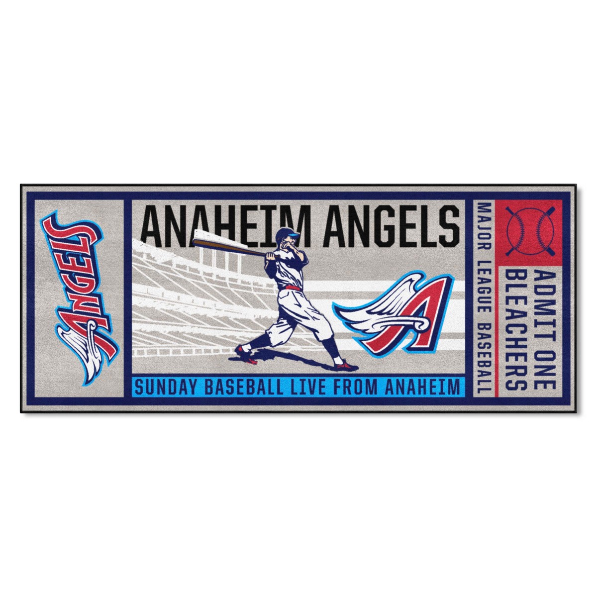 | Anaheim Angels Ticket Runner Rug - 30in. x 72in. 1997 Retro Logo 9 Ounce, 100 % Nylon Face Recycled vinyl backing for a durable and longer-lasting product Machine made and tufted in the USA Non-skid backing with serged borders for added durability Machine washable; vacuum regularly and spot clean for any easy and quick clean Officially licensed and chromojet-printed in true team colors for vibrant, lasting color MLBCC - Los Angeles Angels in California MLB Major League Baseball |