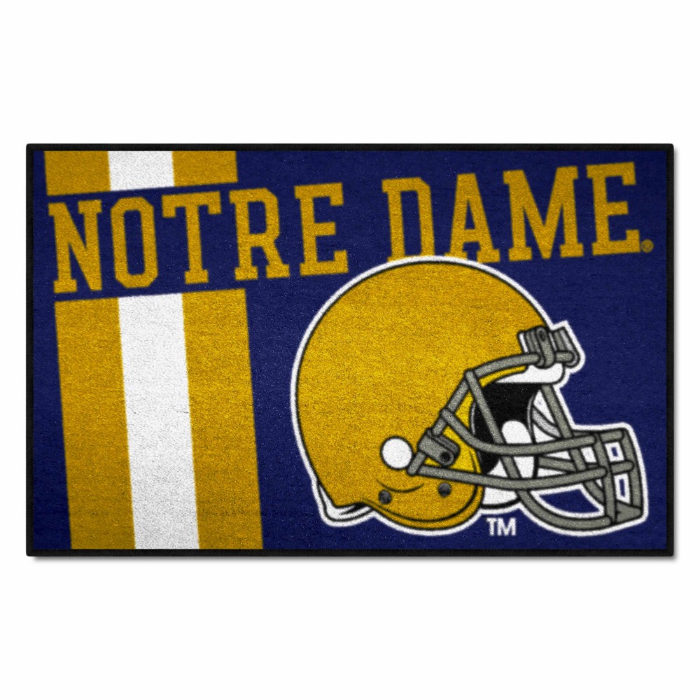| Notre Dame Fighting Irish Starter Mat Accent Rug - 19in. x 30in., Unifrom Design 9 Ounce, 100 % Nylon Face Recycled vinyl backing for a durable and longer-lasting product Machine made and tufted in the USA Non-skid backing with serged borders for added durability Machine washable; vacuum regularly and spot clean for any easy and quick clean Officially licensed and chromojet-printed in true team colors for vibrant, lasting color Notre Dame in Indiana |