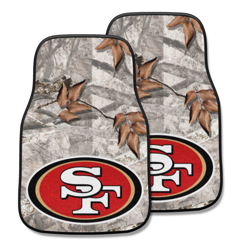 | San Francisco 49ers Camo Front Carpet Car Mat Set - 2 Pieces Universal size to fit all vehicle types 100% Nylon face that is chromojet-printed for true team colors Taped edges and vinyl backing add durability and longer life Nibbed backing to keep from skidding Made in the USA Machine washable for easy cleaning; do not put in dryer NFL - San Francisco 49ers in California NFL National Football League |