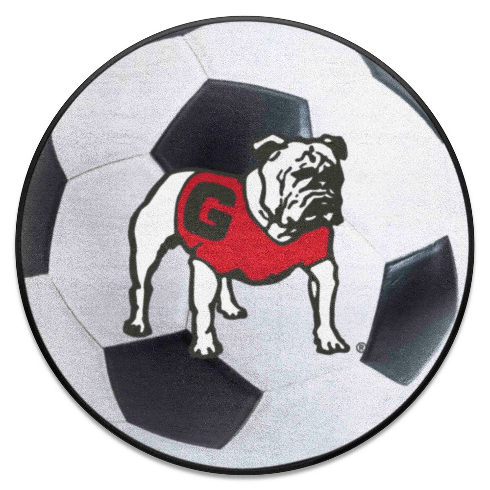 | Georgia Bulldogs Soccer Ball Rug - 27in. Diameter 9 Ounce, 100 % Nylon Face Recycled vinyl backing for a durable and longer-lasting product Machine made and tufted in the USA Non-skid backing with taped borders for added durability Machine washable; vacuum regularly and spot clean for any easy and quick clean Officially licensed and chromojet-printed in true team colors for vibrant, lasting color University of Georgia in Georgia |