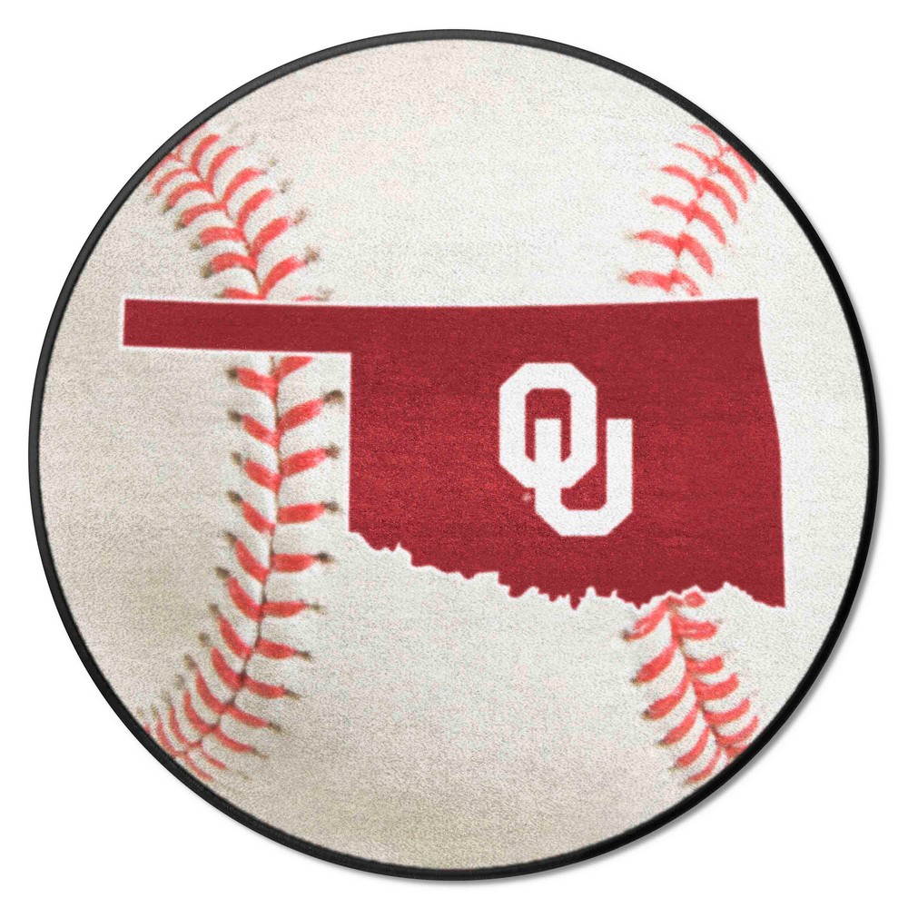 | Oklahoma Sooners Baseball Rug - 27in. Diameter 9 Ounce, 100 % Nylon Face Recycled vinyl backing for a durable and longer-lasting product Machine made and tufted in the USA Non-skid backing with taped borders for added durability Machine washable; vacuum regularly and spot clean for any easy and quick clean Officially licensed and chromojet-printed in true team colors for vibrant, lasting color University of Oklahoma in Oklahoma |