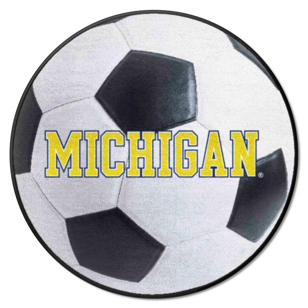 | Michigan Wolverines Soccer Ball Rug - 27in. Diameter 9 Ounce, 100 % Nylon Face Recycled vinyl backing for a durable and longer-lasting product Machine made and tufted in the USA Non-skid backing with taped borders for added durability Machine washable; vacuum regularly and spot clean for any easy and quick clean Officially licensed and chromojet-printed in true team colors for vibrant, lasting color University of Michigan in Michigan |