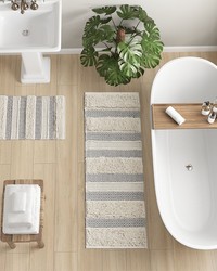 | Ink+ivy 22x58" 1 Bath Runner: 22"W x 58"L Handwoven bath rug: Cotton,Polyester,Other;Transparent sprayed latex back Global Inspired Style Includes 1 Piece(s) Machine washable Globally inspired with an artisan touch, the INK+IVY Asher Woven Texture Stripe Bath Rug is the perfect update to refresh your bathroom decor. This hand-woven bath rug features a combination of beautiful patterns, shaggy textures, and fabric techniques in a vertical stripe layout, for a stylish Boho look and feel. The shaggy woven texture is featured in a solid light light natural hue, which alternates between a grey geo pattern and fabric manipulation technique to create soft dimension and a unique design. Machine washable for easy care; this rug is also finished with a Non-skid resistance latex backing to help keep the rug in place throughout the day. Complete the look of this New INK+IVY bath rug collection with any of our coordinating INK+IVY Shower Curtain, Bedding, and Window Collections, available and sold separately. |