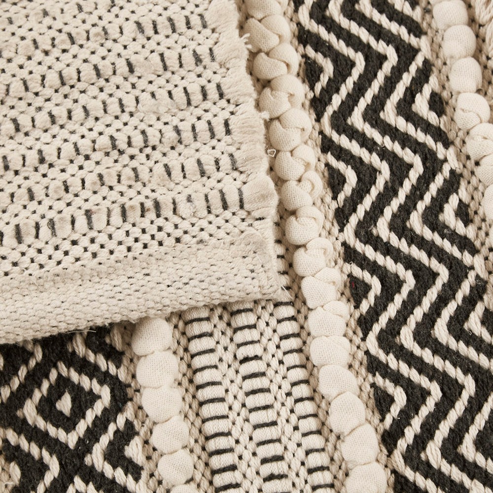 Globally inspired with an artisan touch, the INK+IVY Asher Woven Texture Stripe Bath Rug is the perfect update to refresh your bathroom decor. This hand-woven bath rug features a combination of beautiful patterns, shaggy textures, and fabric techniques in a vertical stripe layout, for a stylish Boho look and feel. The shaggy woven texture is featured in a solid light natural hue, which alternates between a black geo pattern and fabric manipulation technique to create soft dimension and a unique design. Machine washable for easy care; this rug is also finished with a Non-skid resistance latex backing to help keep the rug in place throughout the day. Complete the look of this New INK+IVY bath rug collection with any of our coordinating INK+IVY Shower Curtain, Bedding, and Window Collections, available and sold separately.