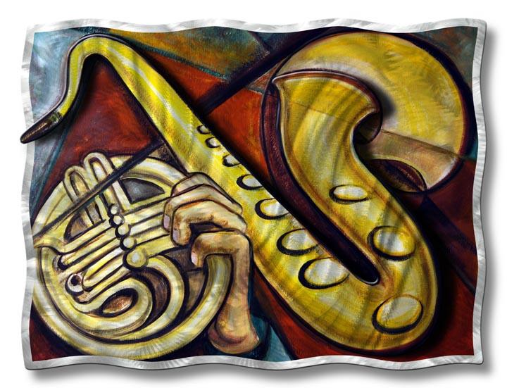| Artist: Ash Carl Designs Year: 2010 Layers: 2 Layers of Metal - 1 Back and 1 Front Just like the soulful sounds of a jazz sax, this piece will stir your senses. Consisting of two hand crafted metal layers giving a three dimensional look to spruce up an ordinary wall. This unique and interesting creation will captivate all veiwers with its sweet visual melody. Certificate of Authenticity Included. |