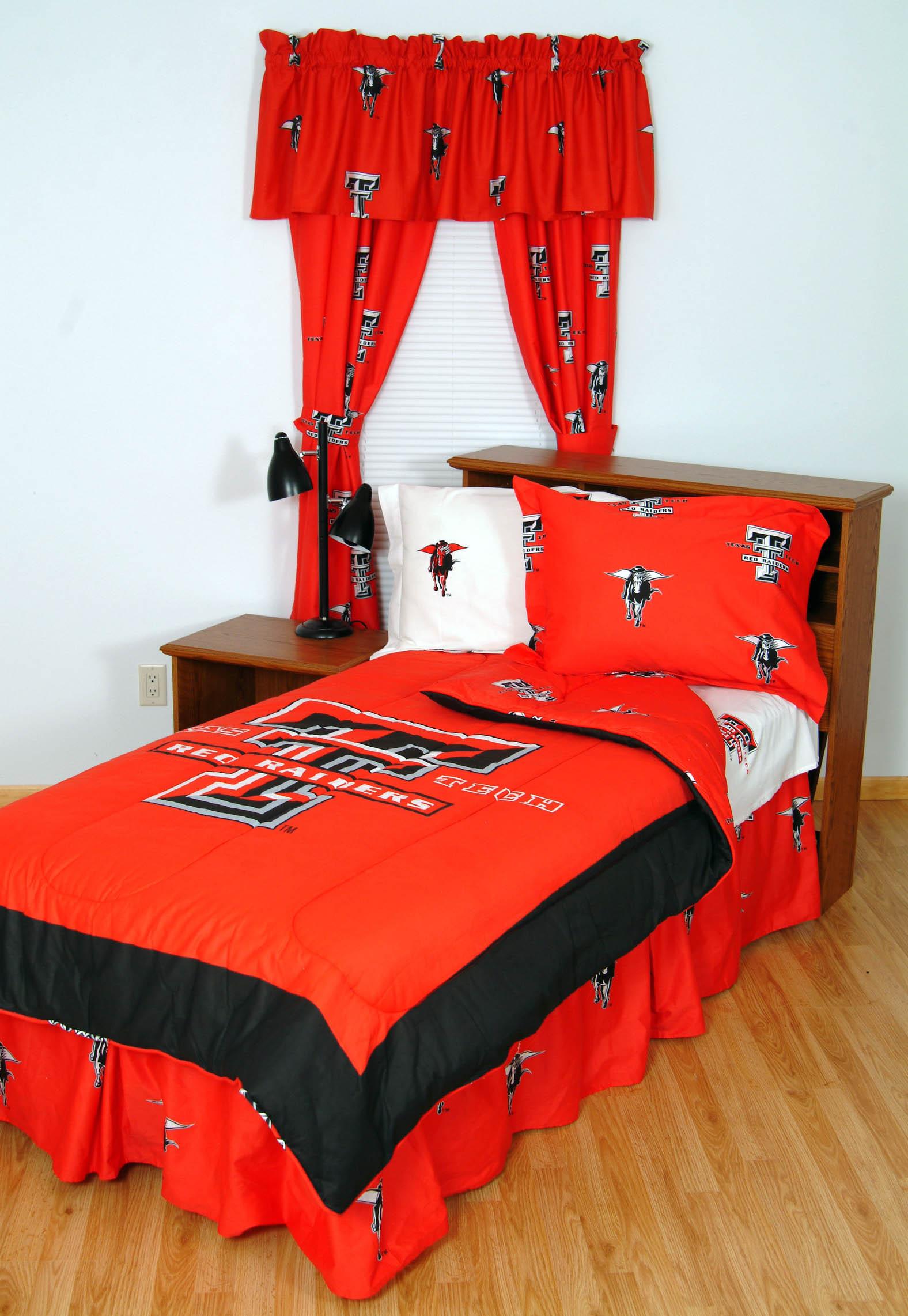 | Texas Tech Red Raiders 100% Cotton Sateen, 200 Thread Count. Bright and Vibrant Offically Licensed Colors and Logos Big Logo On The Front Of The Comforter, All Over Print On Back For A Reversible Comforter Bed In A Bag Includes: Comforter, 2 Shams, Sheet Set With 2 Pillowcases, And A Dust Ruffle Machine Washable In Cold Water, Tumble Dry On Low Heat. Use Commercial Washer and Dryer To Eliminate Chance Of Fabric Rubbing Imported Machine Wash Cold; Tumble Dry Low |