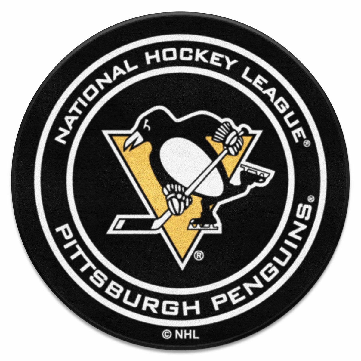 | Pittsburgh Penguins Hockey Puck Rug - 27in. Diameter 9 Ounce, 100 % Nylon Face Recycled vinyl backing for a durable and longer-lasting product Machine made and tufted in the USA Non-skid backing with taped borders for added durability Machine washable; vacuum regularly and spot clean for any easy and quick clean Officially licensed and chromojet-printed in true team colors for vibrant, lasting color NHL - Pittsburgh Penguins in Pennsylvania NHL National Hockey League |