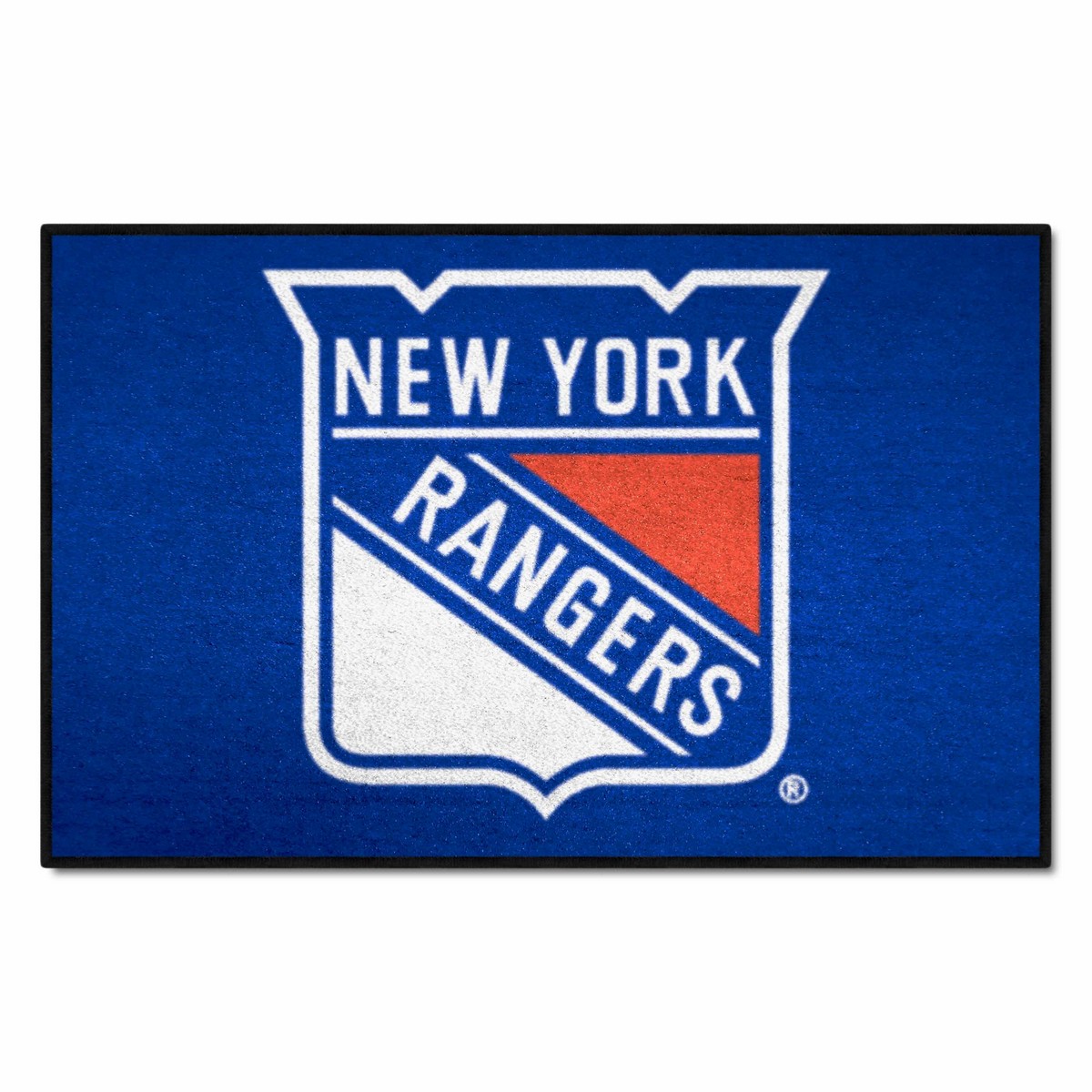 | New York Rangers Starter Mat Accent Rug - 19in. x 30in. 9 Ounce, 100 % Nylon Face Recycled vinyl backing for a durable and longer-lasting product Machine made and tufted in the USA Non-skid backing with serged borders for added durability Machine washable; vacuum regularly and spot clean for any easy and quick clean Officially licensed and chromojet-printed in true team colors for vibrant, lasting color NHL - New York Rangers in New York NHL National Hockey League |