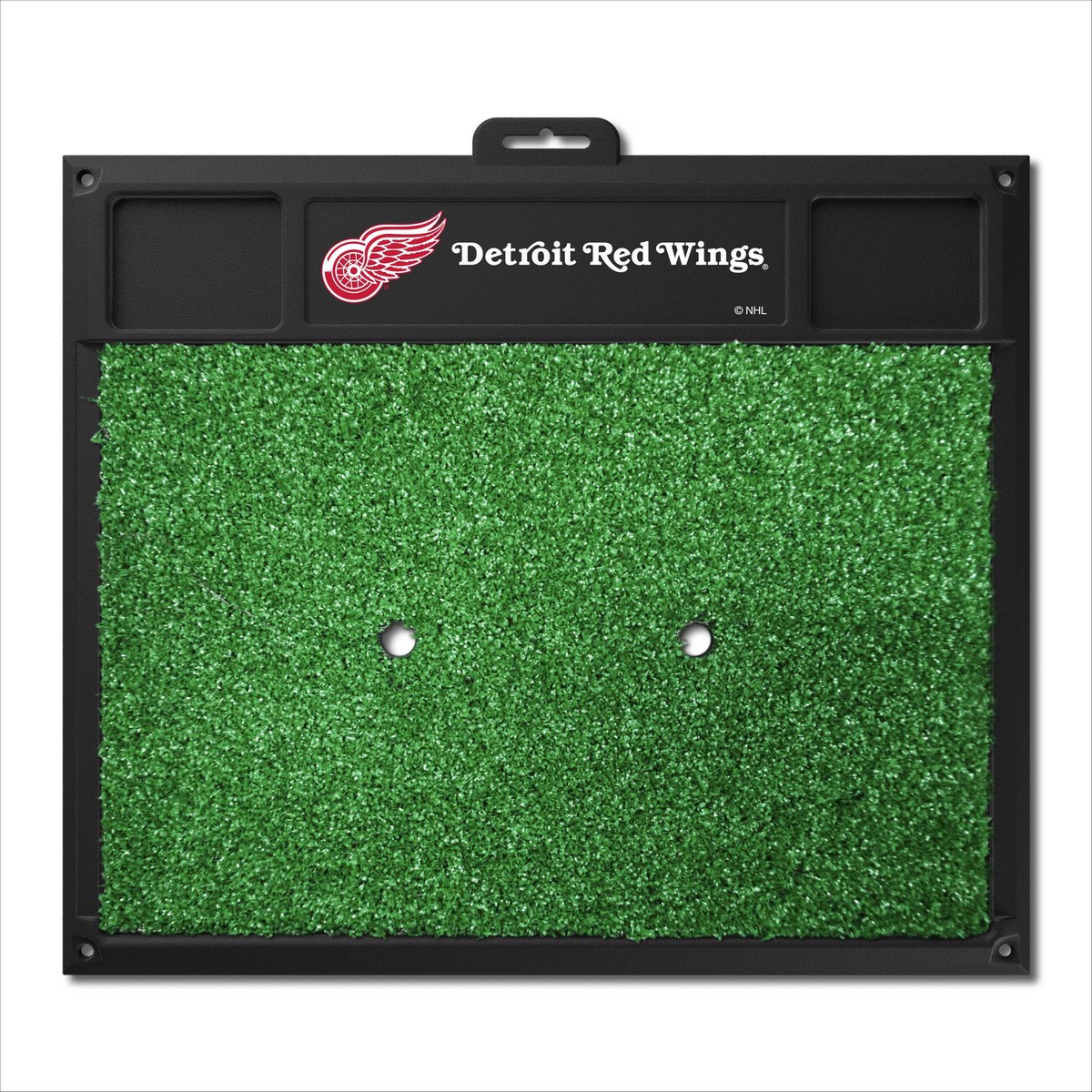 | Detroit Red Wings Golf Hitting Mat Dual tee design for left and right handed golfers Removable tee also accepts wooden tees Stays in place; anchor mat down in all four corners with tees Cups to hold your balls and tees Made of heavy duty vinyl and has a realistic turf Saves your lawn from divots NHL - Detroit Red Wings in Michigan NHL National Hockey League |