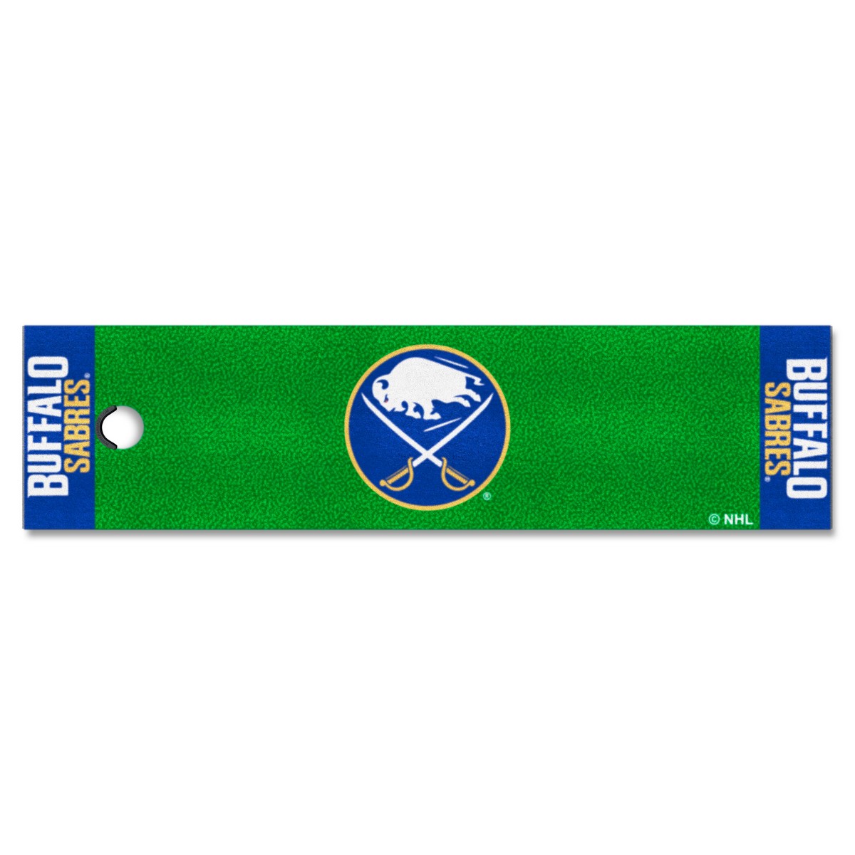 | Buffalo Sabres Putting Green Mat - 1.5ft. x 6ft. Realistic putting surface (11* on golf Stimpmeter) Includes putting target barrier/backstop Durable vinyl backing keeps mat in place 100% Nylon Face Doubles as a runner when not in use Officially licensed and chromojet printed in true team colors NHL - Buffalo Sabres in New York NHL National Hockey League |