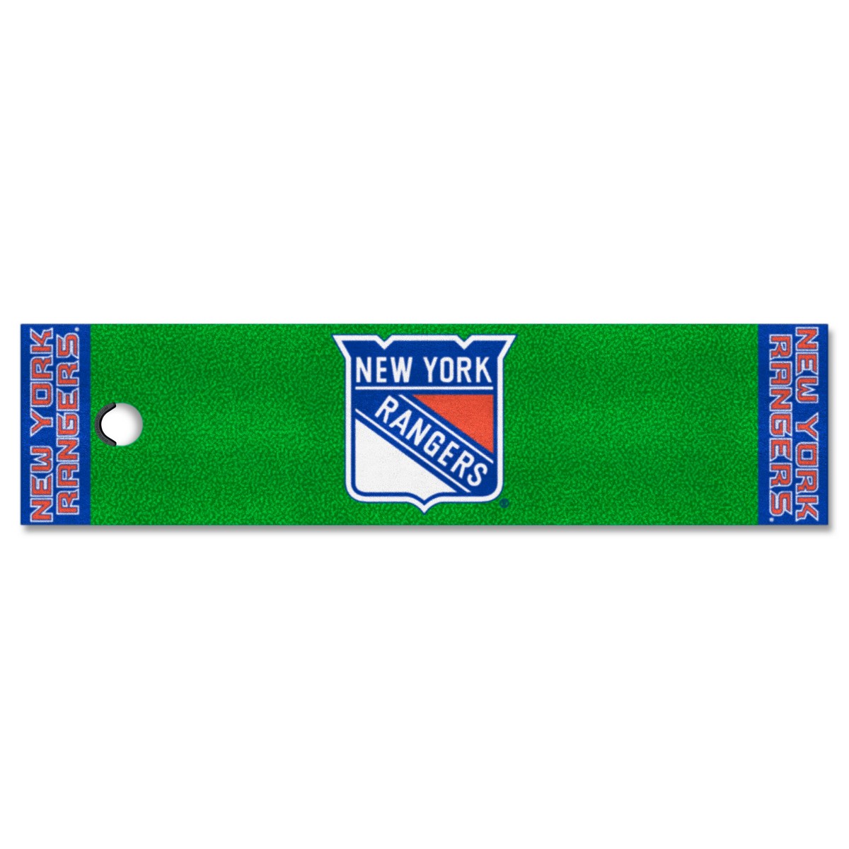 | New York Rangers Putting Green Mat - 1.5ft. x 6ft. Realistic putting surface (11* on golf Stimpmeter) Includes putting target barrier/backstop Durable vinyl backing keeps mat in place 100% Nylon Face Doubles as a runner when not in use Officially licensed and chromojet printed in true team colors NHL - New York Rangers in New York NHL National Hockey League |