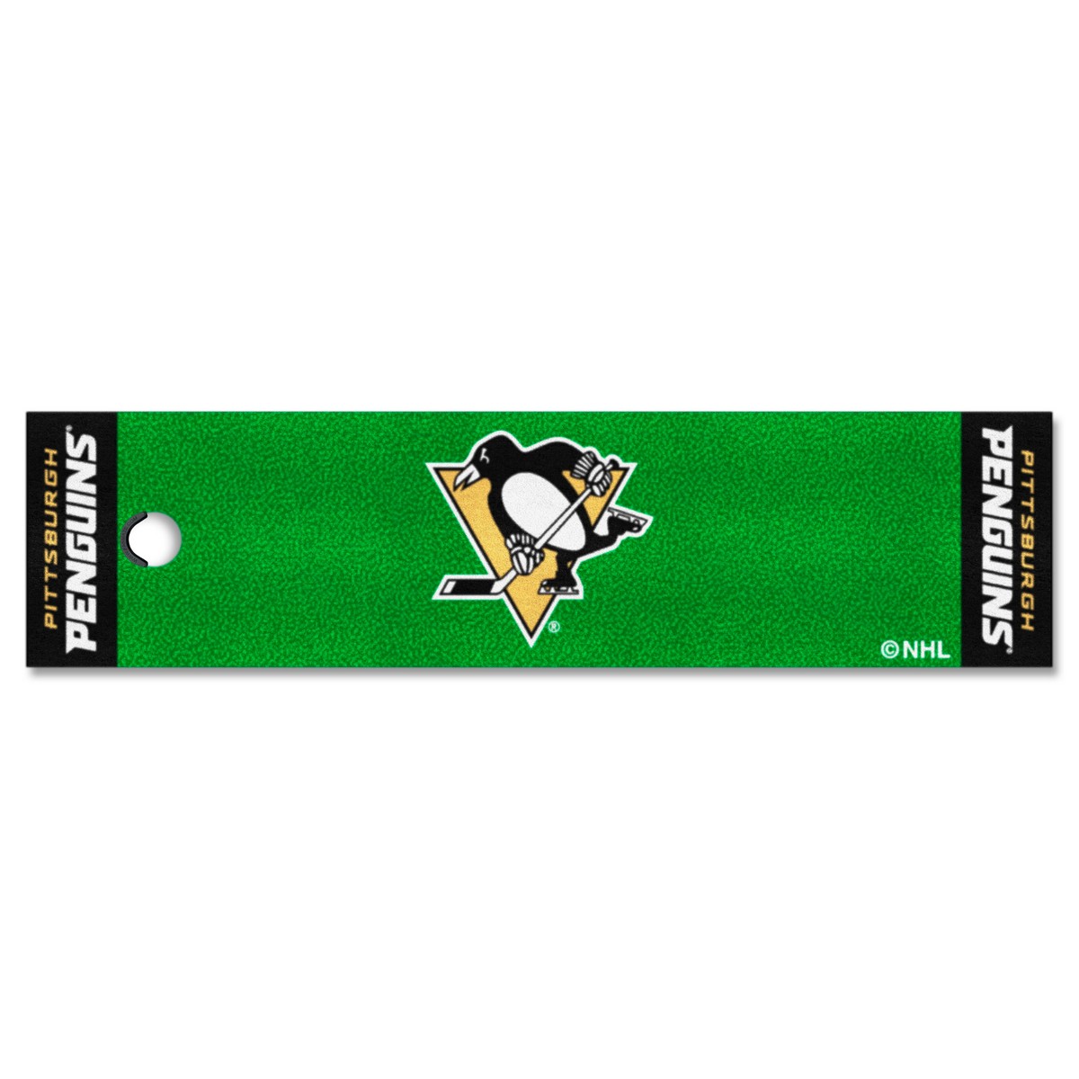 | Pittsburgh Penguins Putting Green Mat - 1.5ft. x 6ft. Realistic putting surface (11* on golf Stimpmeter) Includes putting target barrier/backstop Durable vinyl backing keeps mat in place 100% Nylon Face Doubles as a runner when not in use Officially licensed and chromojet printed in true team colors NHL - Pittsburgh Penguins in Pennsylvania NHL National Hockey League |
