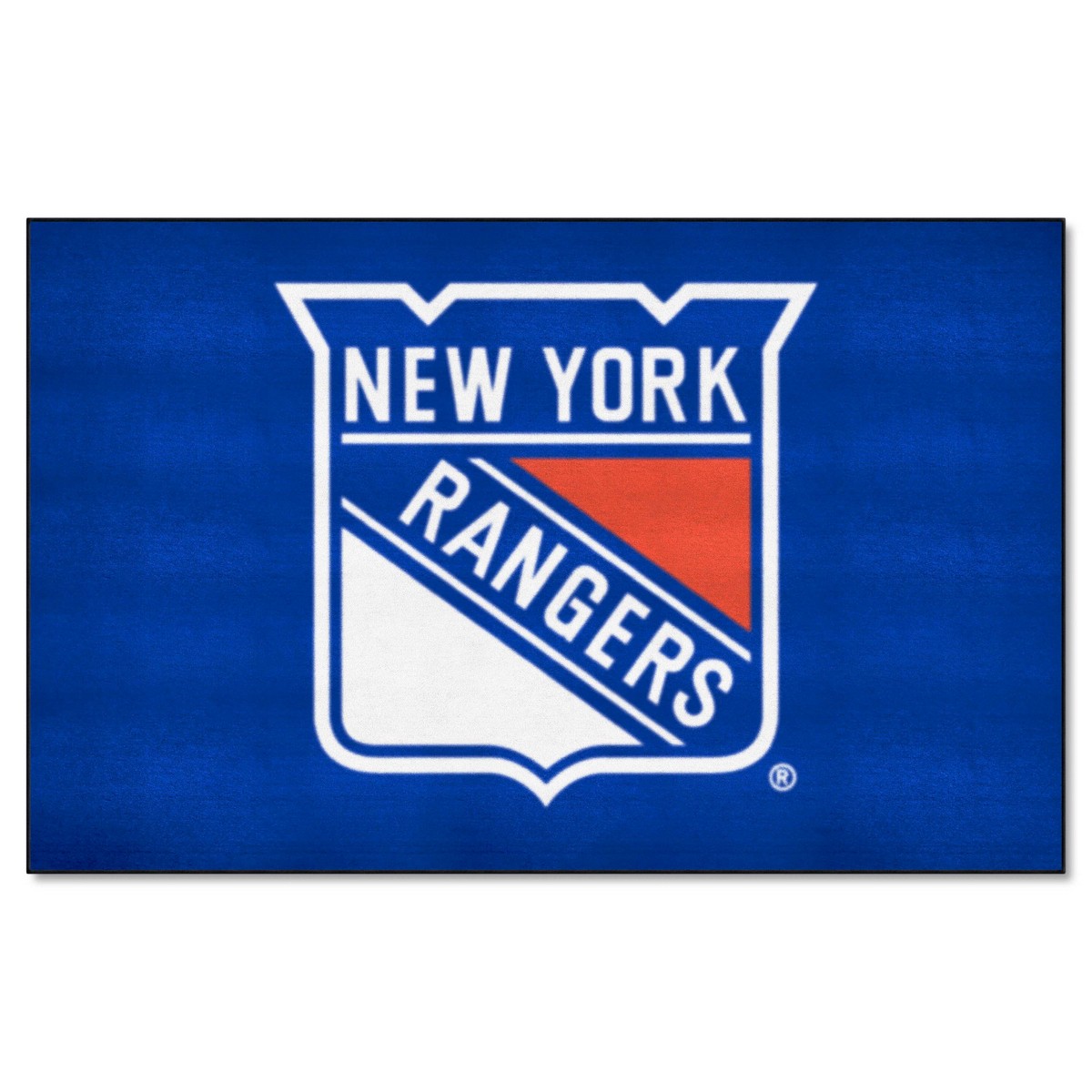 | New York Rangers Ulti-Mat Rug - 5ft. x 8ft. 9 Ounce, 100 % Nylon Face Recycled vinyl backing for a durable and longer-lasting product Machine made and tufted in the USA Non-skid backing with serged borders for added durability Machine washable; vacuum regularly and spot clean for any easy and quick clean Officially licensed and chromojet-printed in true team colors for vibrant, lasting color NHL - New York Rangers in New York NHL National Hockey League |