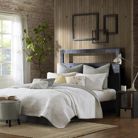 | 1 Coverlet 2 Shams Off-white with taupe channel stitching and embroidery in geometric pattern. |