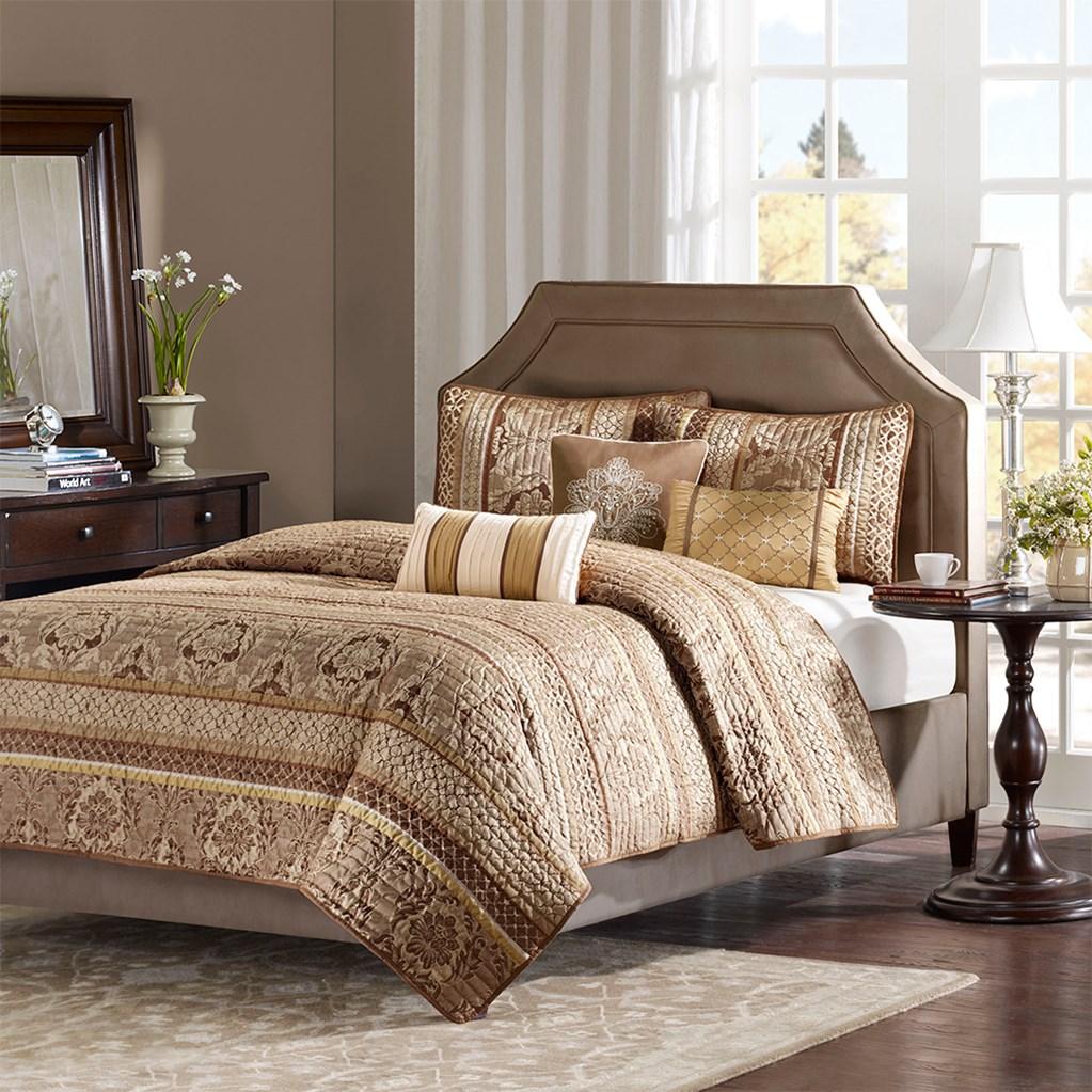 | 1 Coverlet 2 King Shams 3 Pillows Lovely polyester jaquard bedding set features leaf, ironwork and stripes on a rich chocolate brown background. Hints of gold add richness to this luxurious bed set. King |