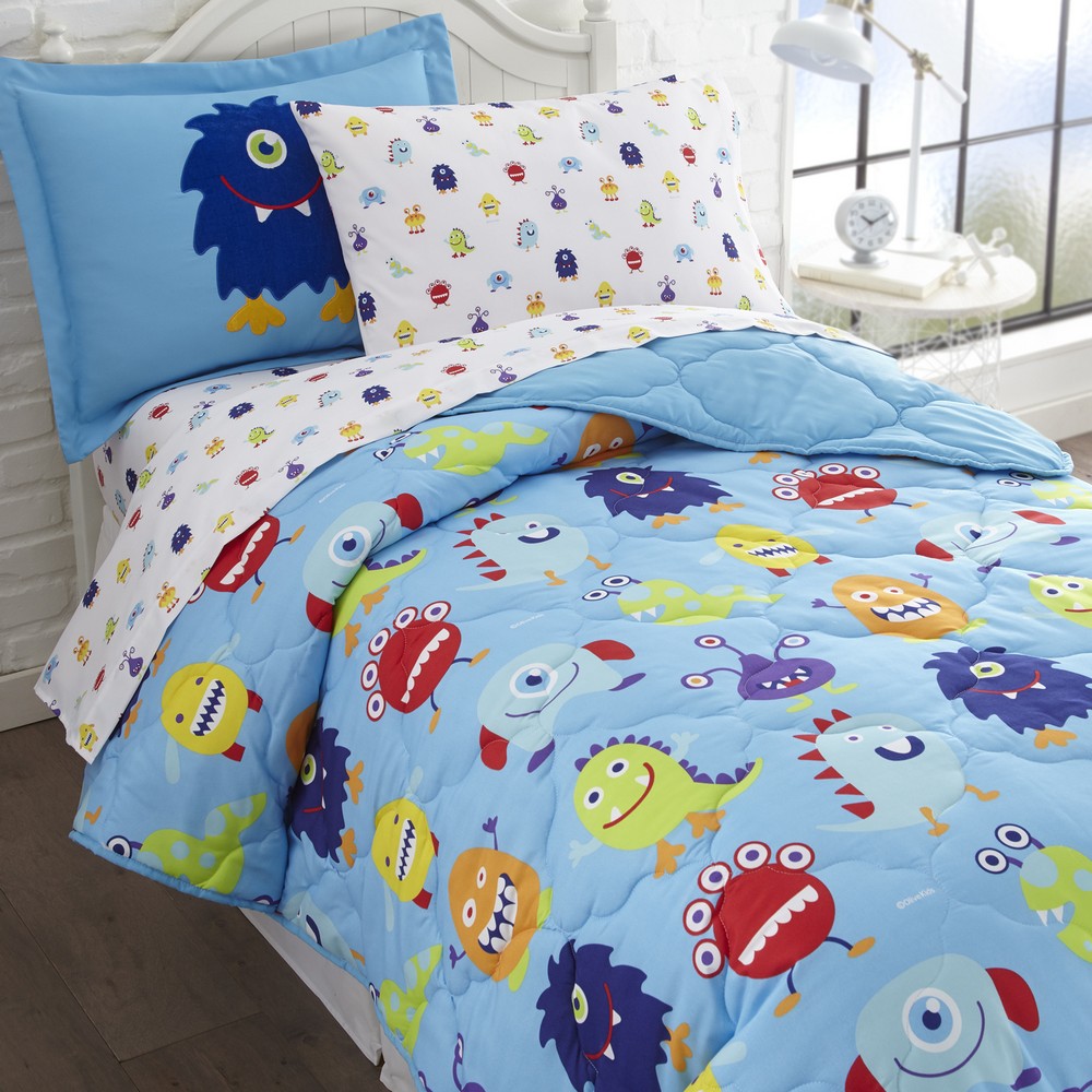 | Cute and colorful monsters adorn the comforter made from extra soft microfiber fabrics. 5 piece set by Olive Kids includes a printed comforter, flat top sheet, fitted bottom sheet, printed pillowcase, and an embroidered sham. Boys Room Bedding |