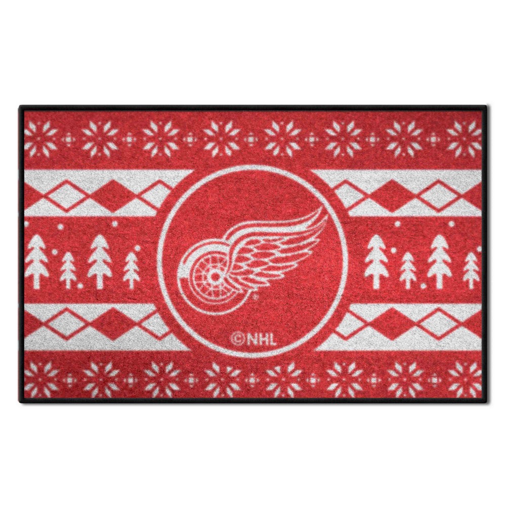 | Detroit Red Wings Holiday Sweater Starter Mat Accent Rug - 19in. x 30in. 9 Ounce, 100 % Nylon Face Recycled vinyl backing for a durable and longer-lasting product Machine made and tufted in the USA Non-skid backing with serged borders for added durability Machine washable; vacuum regularly and spot clean for any easy and quick clean Officially licensed and chromojet-printed in true team colors for vibrant, lasting color NHL - Detroit Red Wings in Michigan NHL National Hockey League |
