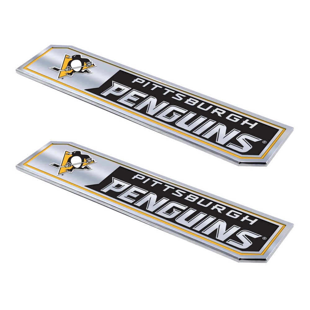 | Pittsburgh Penguins 2 Piece Heavy Duty Aluminum Embossed Truck Emblem Set Comes in a 2-Pack Set Rectangular in Shape with Unique Angles Designed to Compliment Any Truck or Car Features Team Colored Logo and Raised Team Wordmark Easy application with full auto adhesive backing Made with corrosion resistant aluminum Approximately 1.75in x 8.25in NHL - Pittsburgh Penguins in Pennsylvania NHL National Hockey League |
